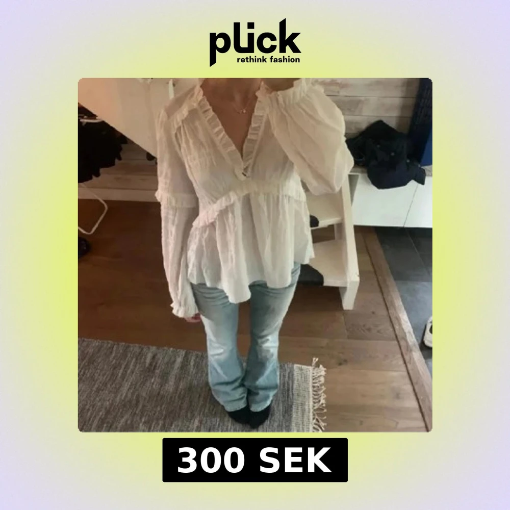 INTRESSEKOLL på denna fina blus från NA-KD🤍. Supersöt vit blus med v-ringning och volangdetaljer längs halsringningen och ärmsluten. Blusen har långärmade puffärmar och en luftig, flowy passform. 💕💕💕🥹