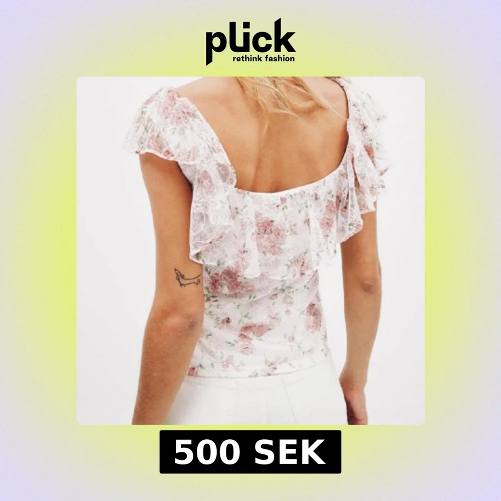 Supersöt blus i vitt med rosa blommigt mönster och volangdetaljer över axlarna. Storlek S men passar allt den Xs-S. Perfekt för dig som gillar en feminin och somrig stil. Den är ny med prislapp.