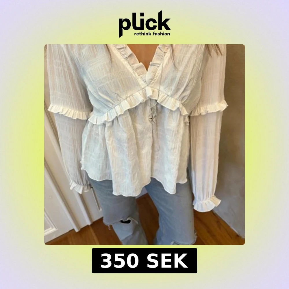 Vit blus med volang och v-ringning - Säljer en luftig vit blus med v-ringning och volangdetaljer. Blusen har långa ärmar och en lös passform, perfekt för en avslappnad men ändå stilren look. Passar till både jeans och kjol.