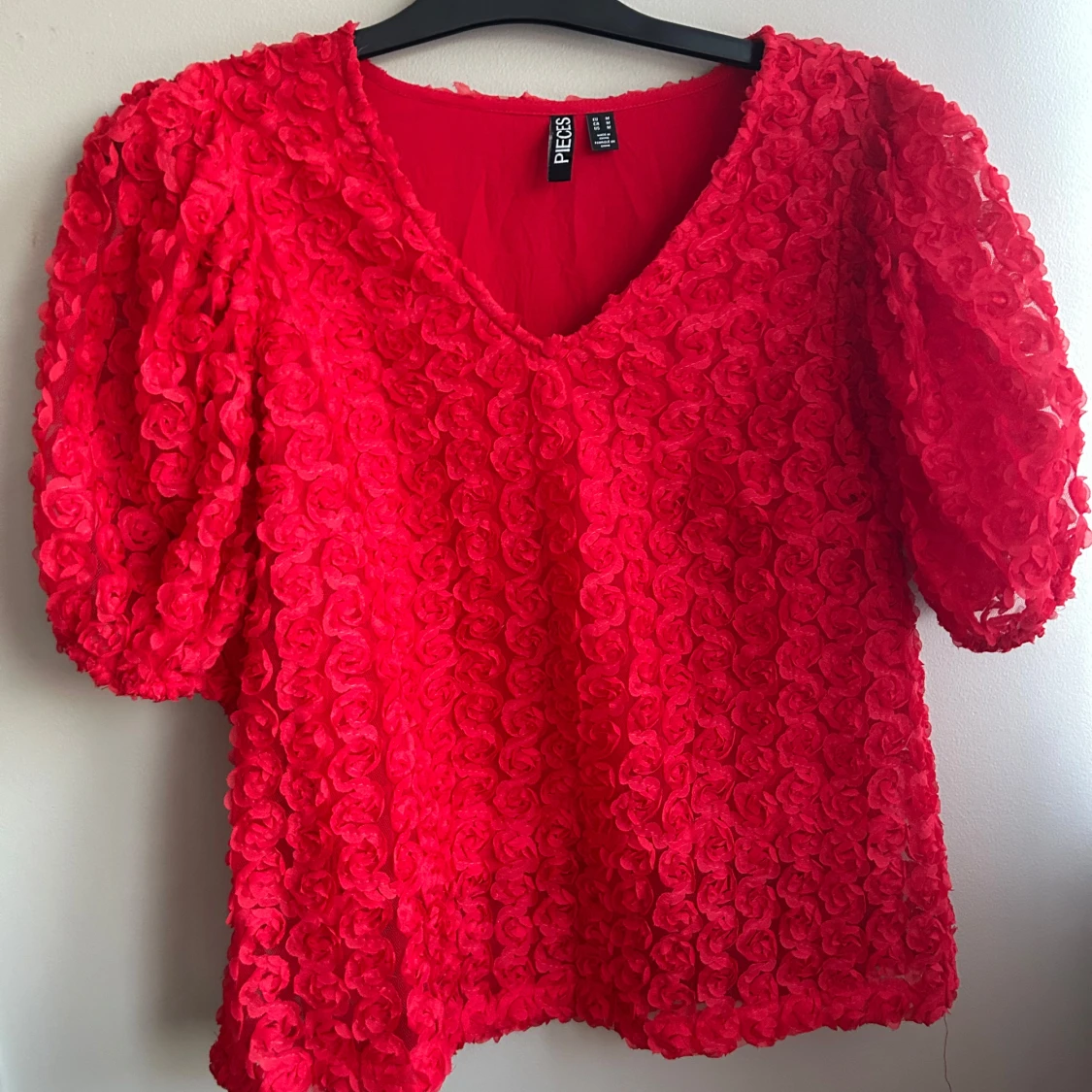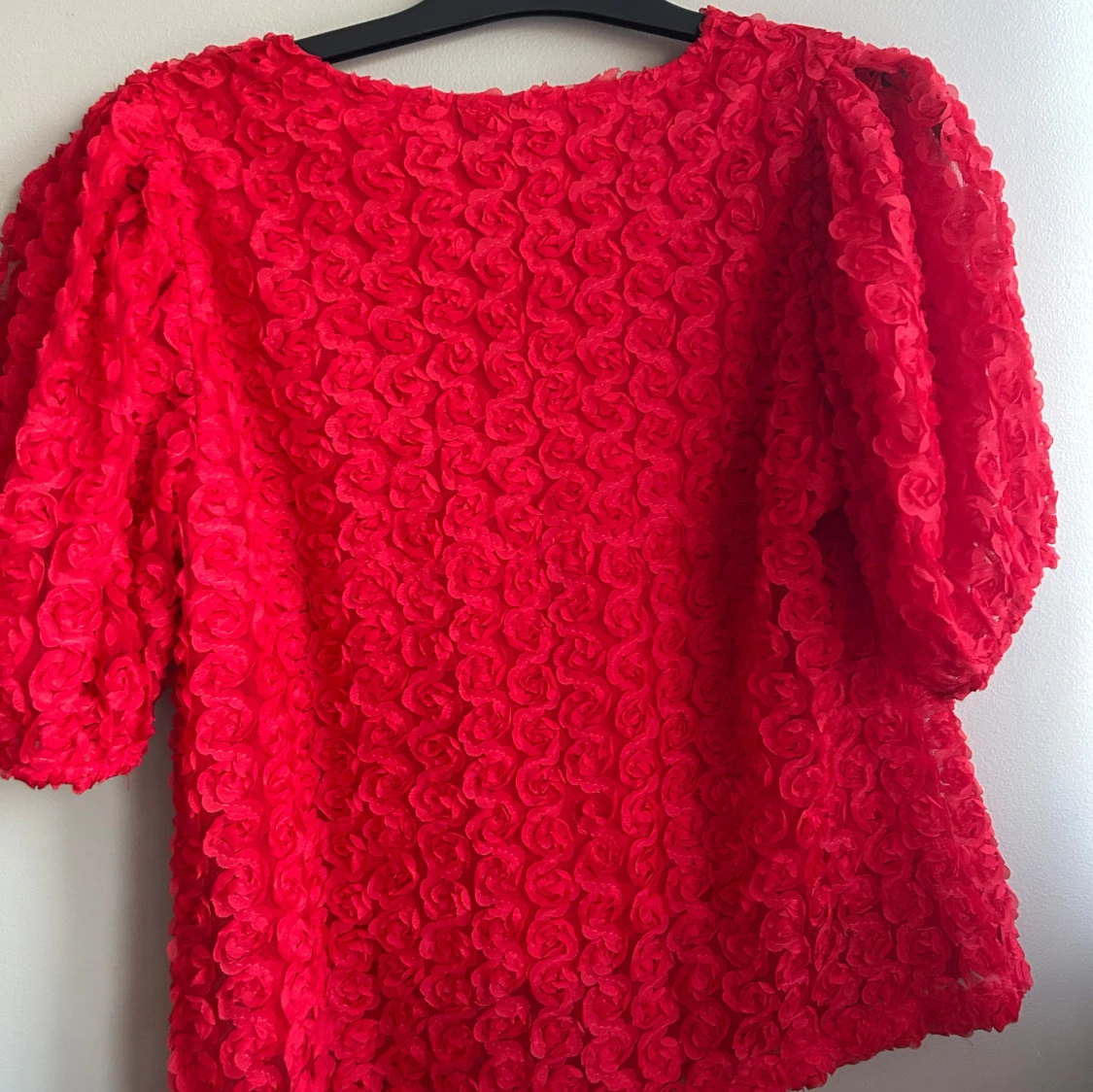 Säljer denna röda fina topp perfekt till jul. Den är i mycket fint skick endast använd vid två tillfällen. Det är som små rosor på hela tröjan verkligen så fint. Från Nelly i storlek M men passar S bra också