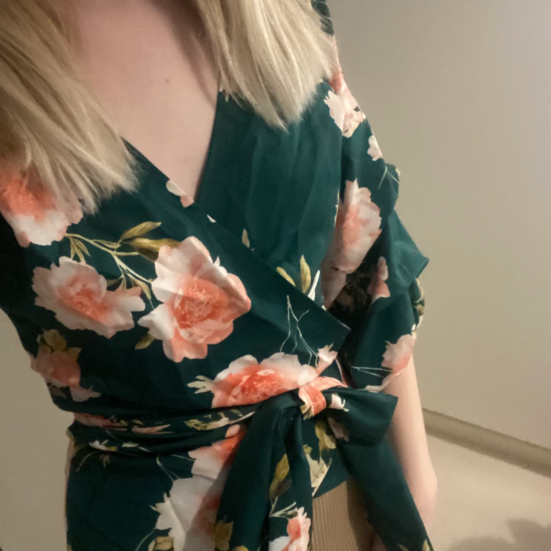 Grönblommig blus/tröja med knytning i midjan. Från NLY trend i storlek 36 men passar även 34.