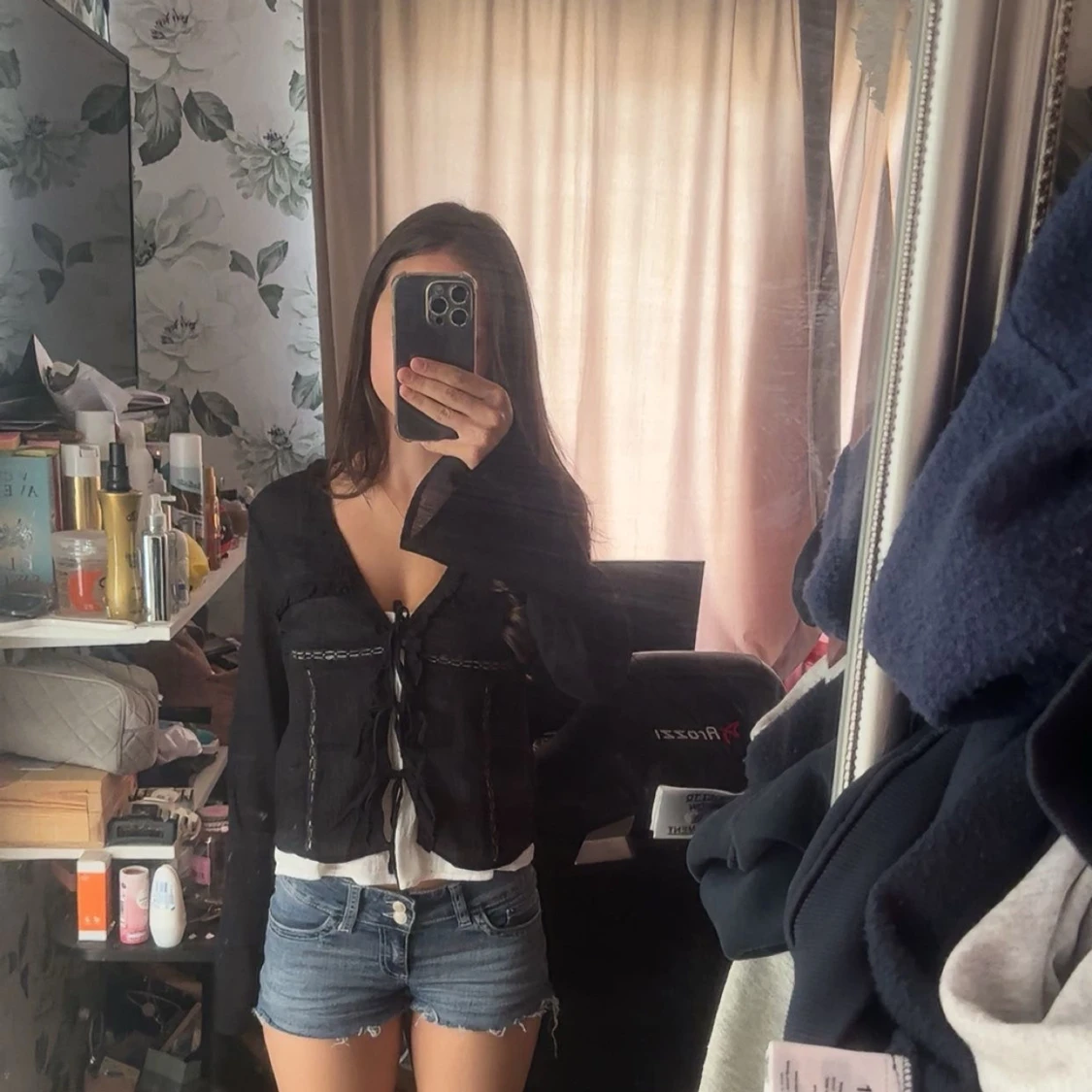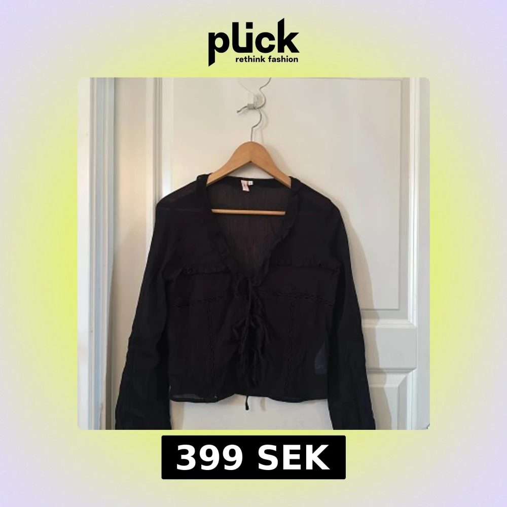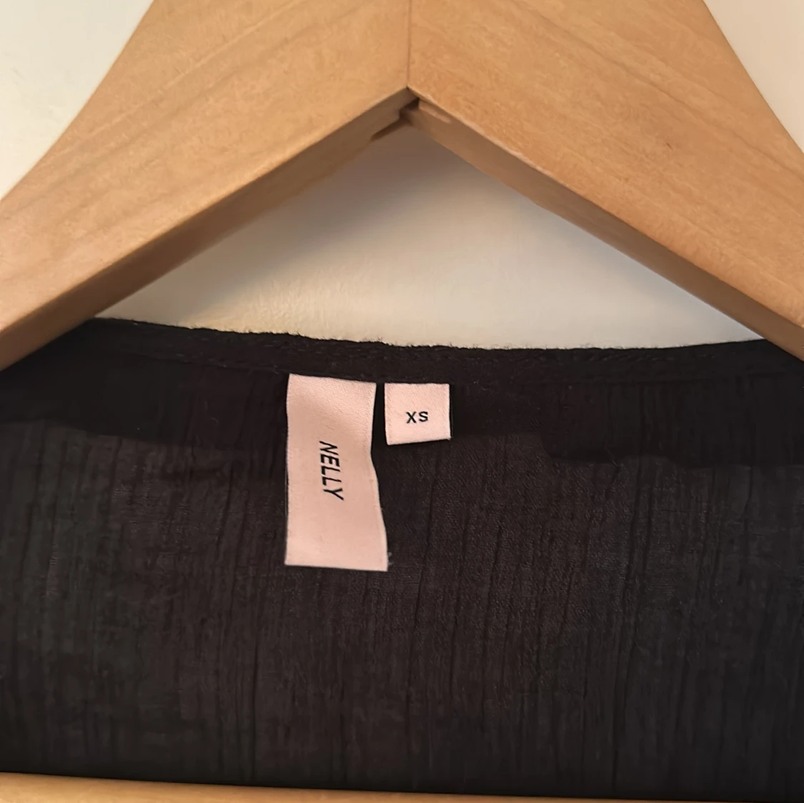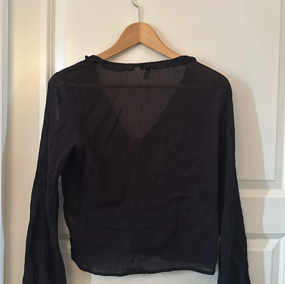Svart transparent blus från Nelly i storlek XS. Blusen har långa ärmar, v-ringning och snygga volangdetaljer längs halsen. Framtill finns snörning som ger en cool touch. Materialet är lätt och luftigt, perfekt för att styla med jeans eller kjol.