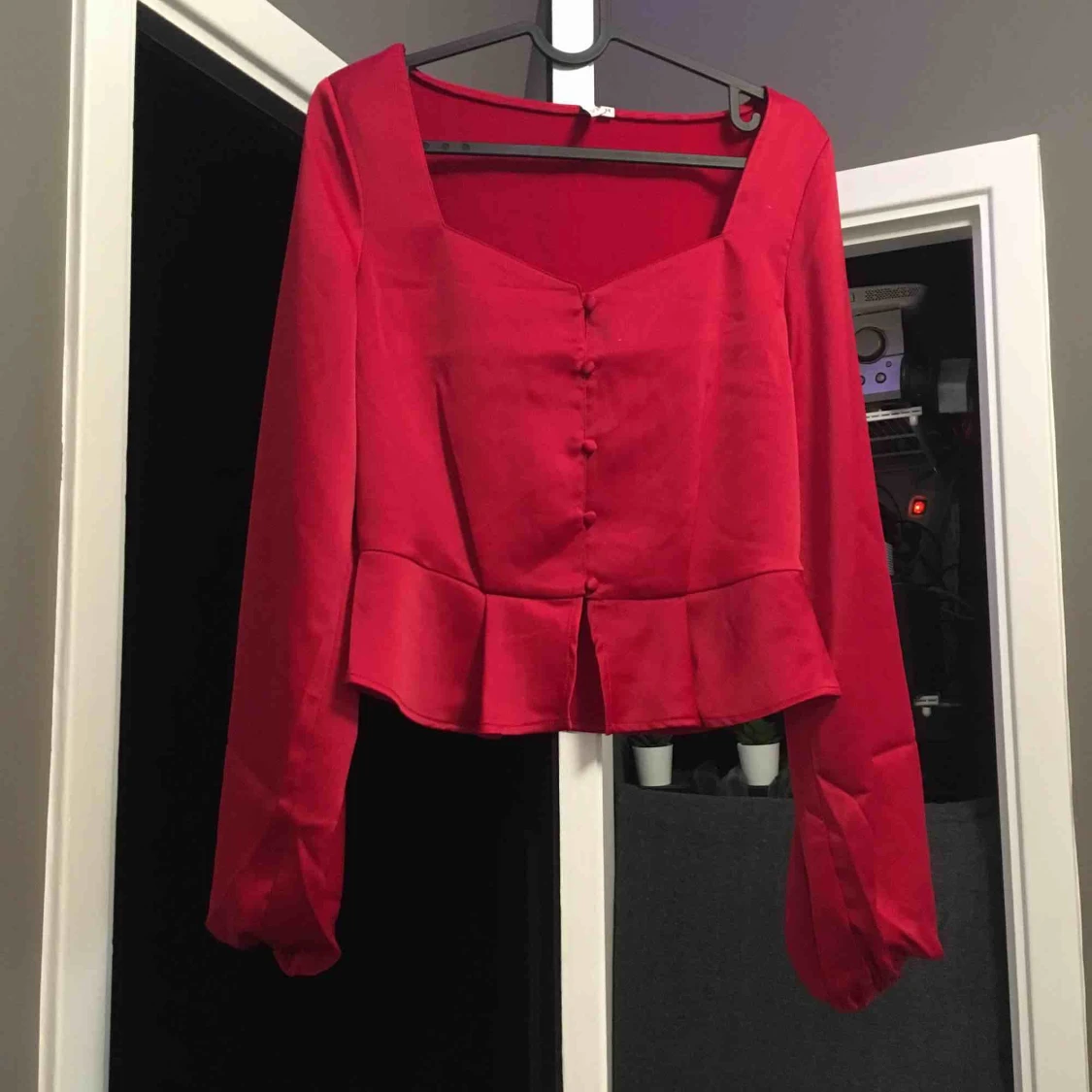 Mycket elegant och fin fest röd blus. Aldrig använd endast provad och bysthalsen är för stor för mig. Färgen är mer mörkröd än det som syns på bilden ❤️