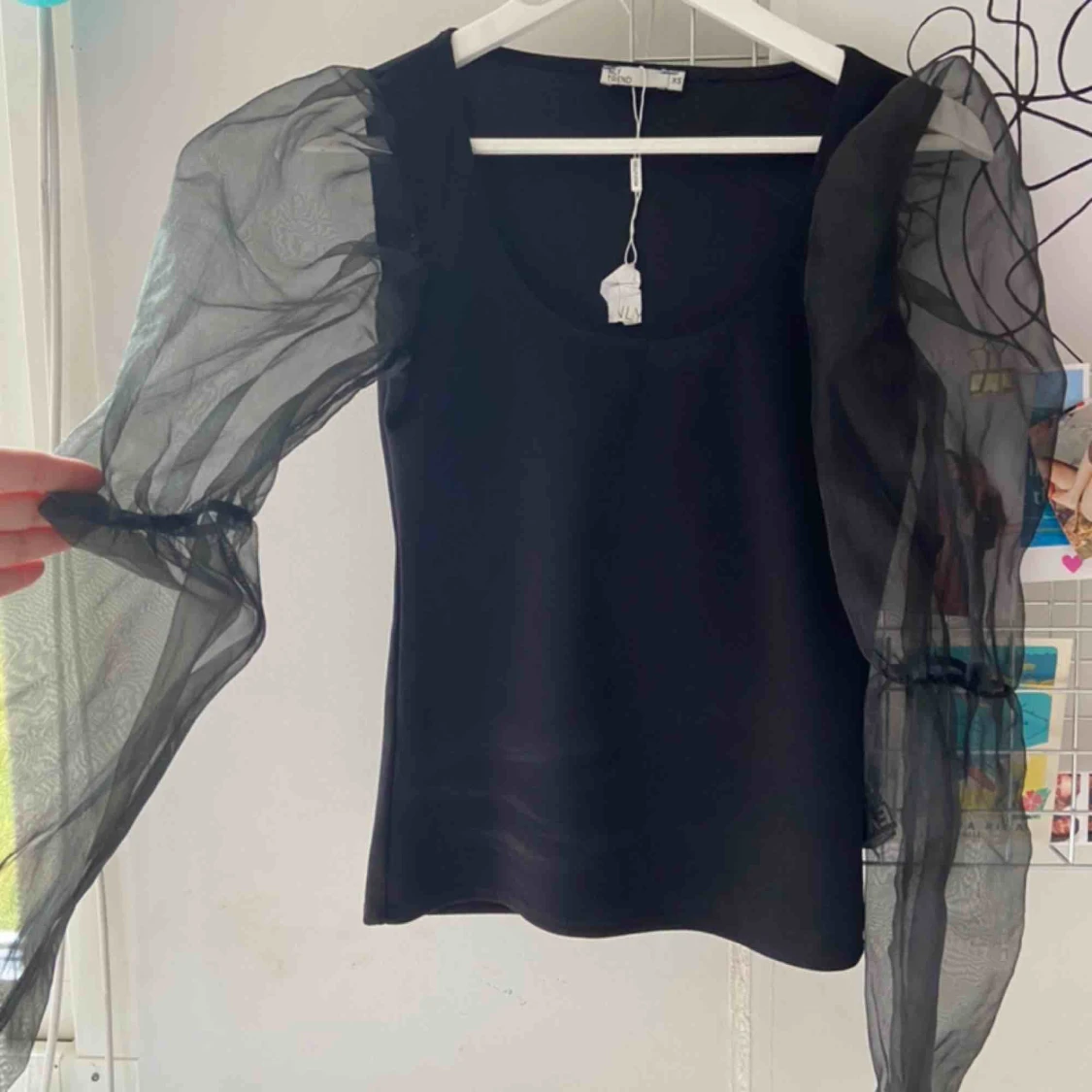 Topp med fluffiga ärmar från Nelly, ALDRIG använd pga för liten (prislappen är kvar men gick sönder när jag råkade tvätta den med prislappen på🌝) jättegullig