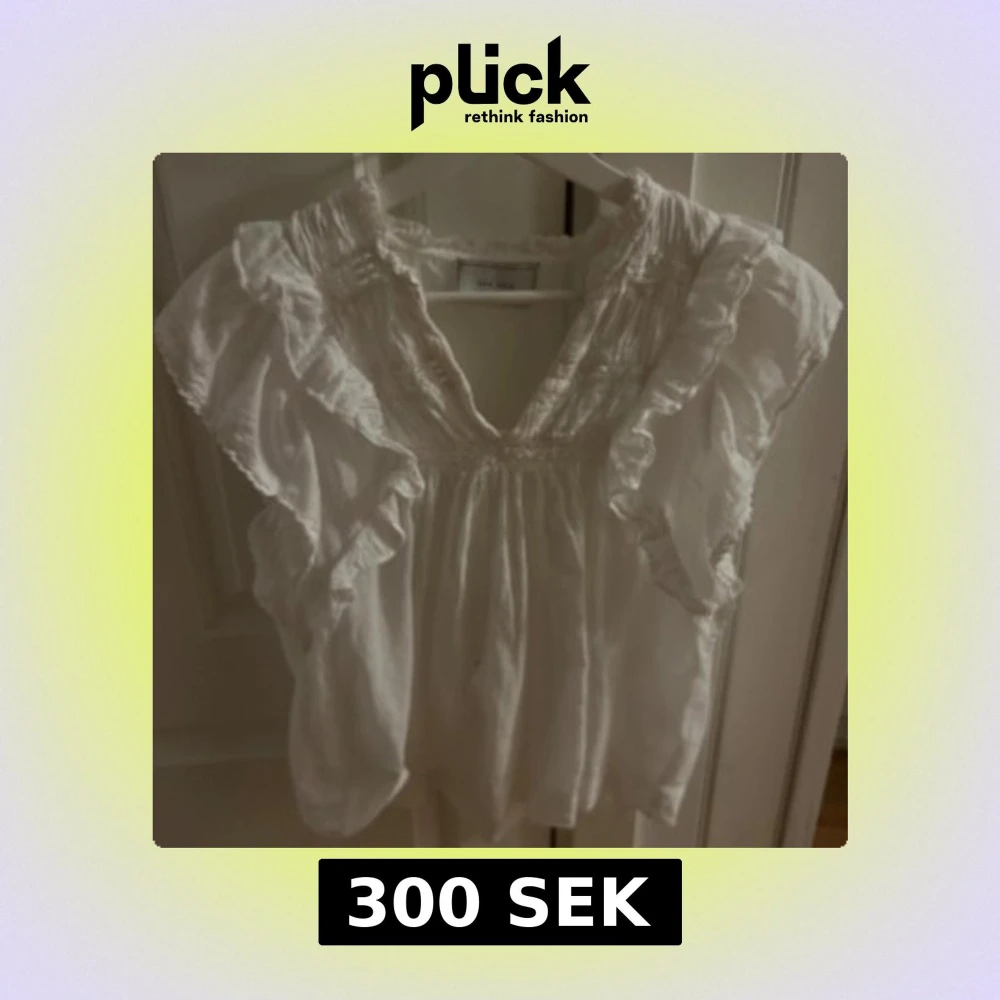 Säljer en söt vit blus från neo noir med volangdetaljer på axlarna och v-ringad hals. Supersnygg att styla med jeans eller kjol!