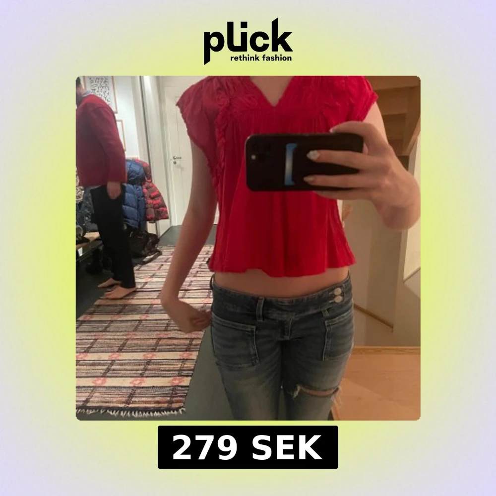 Säljer en röd blus från Neo Noir med v-ringning, volangdetaljer och smockade partier. Blusen är kort och har ärmlös design med romantiska spetsdetaljer och luftig känsla. Perfekt för dig som gillar färgstarka och feminina plagg.