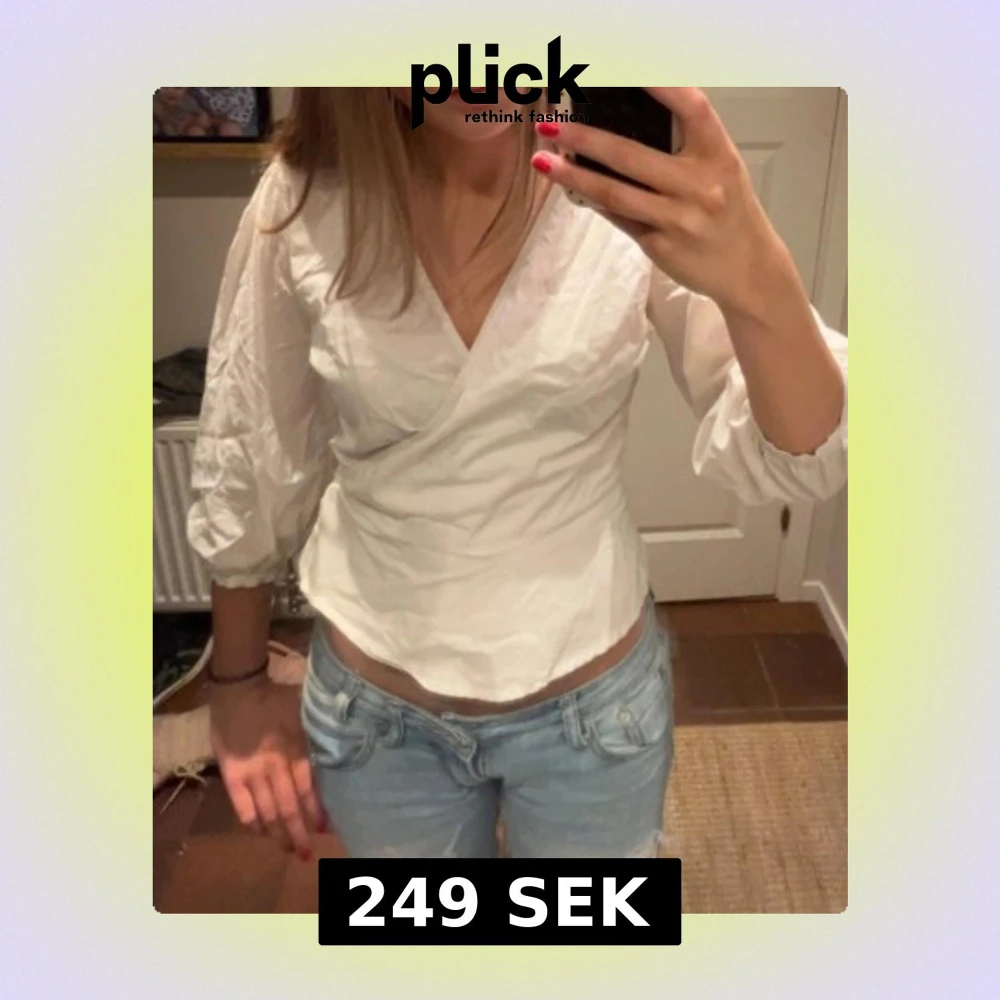 Säljer en fräsch vit omlottblus med trekvartsärmar och lätt puff vid axlarna. Blusen har v-ringning och en figurnära passform som framhäver midjan. Perfekt att styla med jeans eller kjol för en clean look.