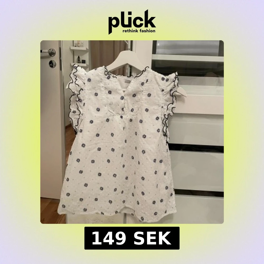 Söt vit blus från Lindex med små blå blommor och puffärmar. Lätt och mjuk bomullskvalitet som känns skön mot huden. Knappslå framtill och som passar både till vardag och fest. Storlek 158/164. Mycket fint skick – knappt använd och ser nästan ny ut. (Andvänd 1 gång)
