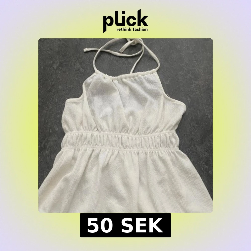 Supersöt vit topp från Monki med halterneck och smockad midja. Klänningen har en lätt textur i tyget och tunna knytband i nacken. Perfekt för varma dagar när du vill känna dig både chill och stylish. Oanvänd, då den aldrig kommit till användning.