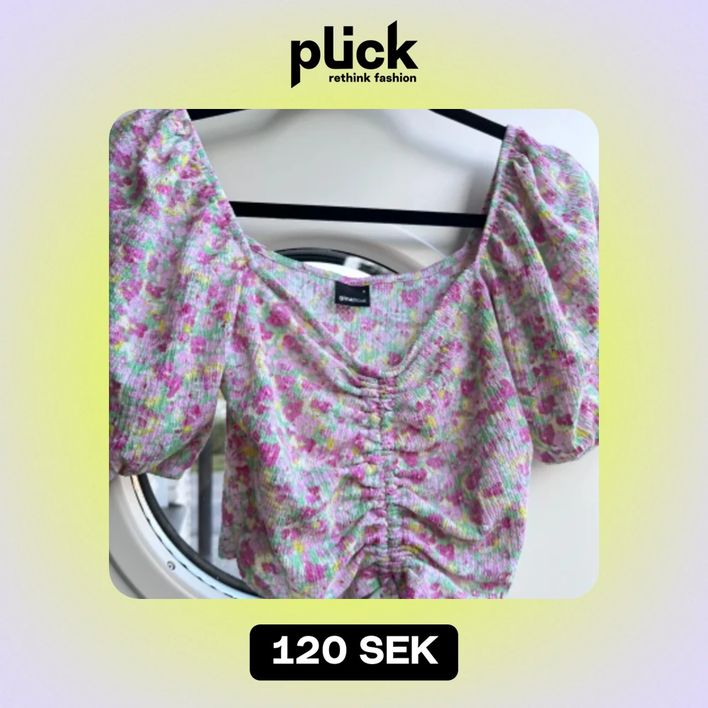 Stretchig blus från Gina Tricot med blommönster 🌷 Knyrning i mitten, resår vid ärmsluten och vid axlarna. Normal i storleken, passar perfekt på mig som har S! (ALDRIG ANVÄND)