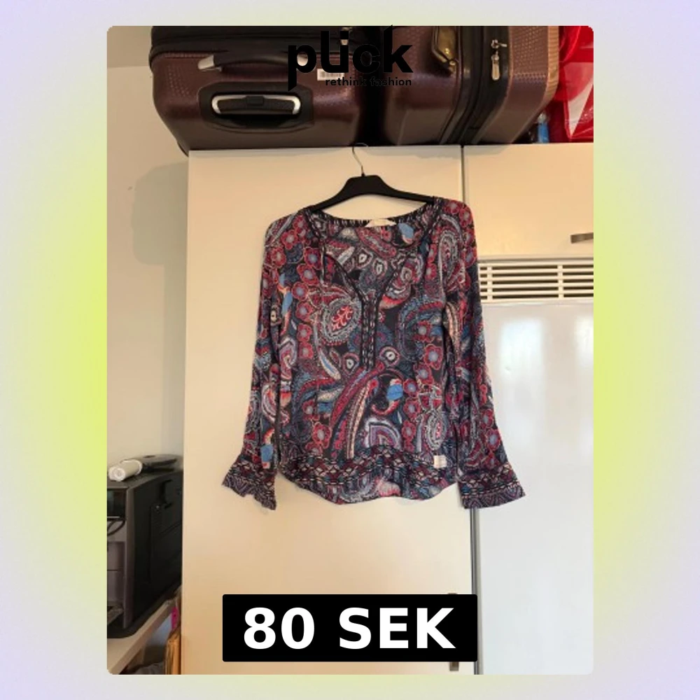 Säljer en otroligt vacker blus med en bottenfärg i mörkblå. Den har ett superfint detaljerat mönster i bland annat rött, blått, svart och vitt. Från märket Odd Molly. Storlek 2 som enligt deras storleksguide motsvarar en M. Mer använd men fortfarande fint skick.