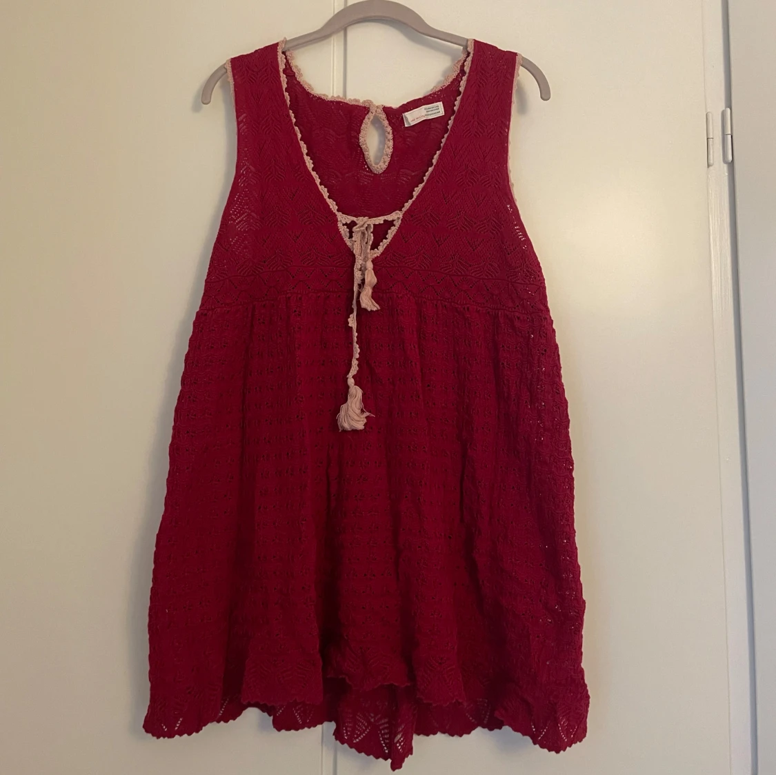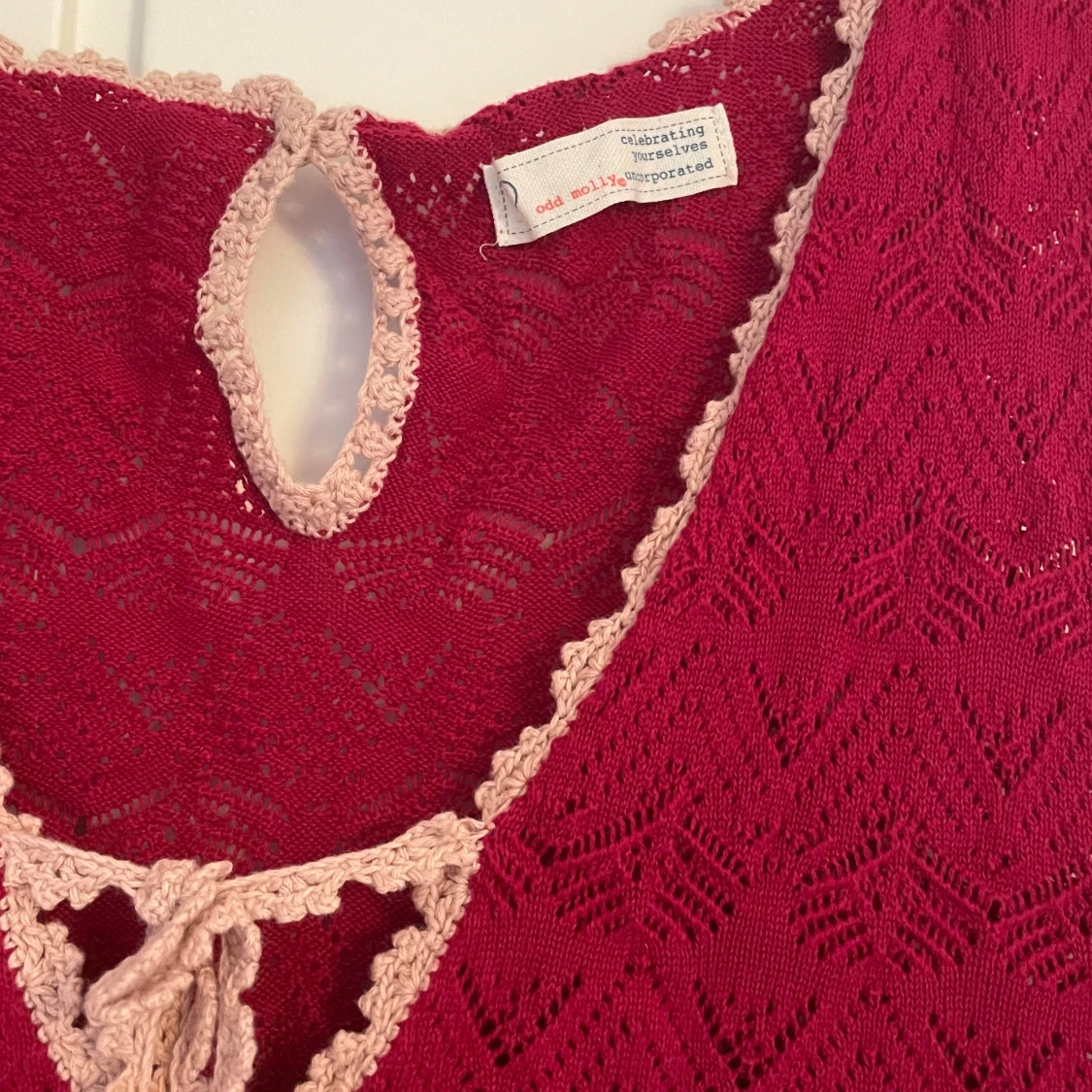 Charmig röd tröja från Odd Molly med vackert spetsmönster och knytning framtill. Den är ärmlös och har en luftig passform, perfekt för varma dagar. Den dekorativa kanten och knytningen ger en bohemisk touch.