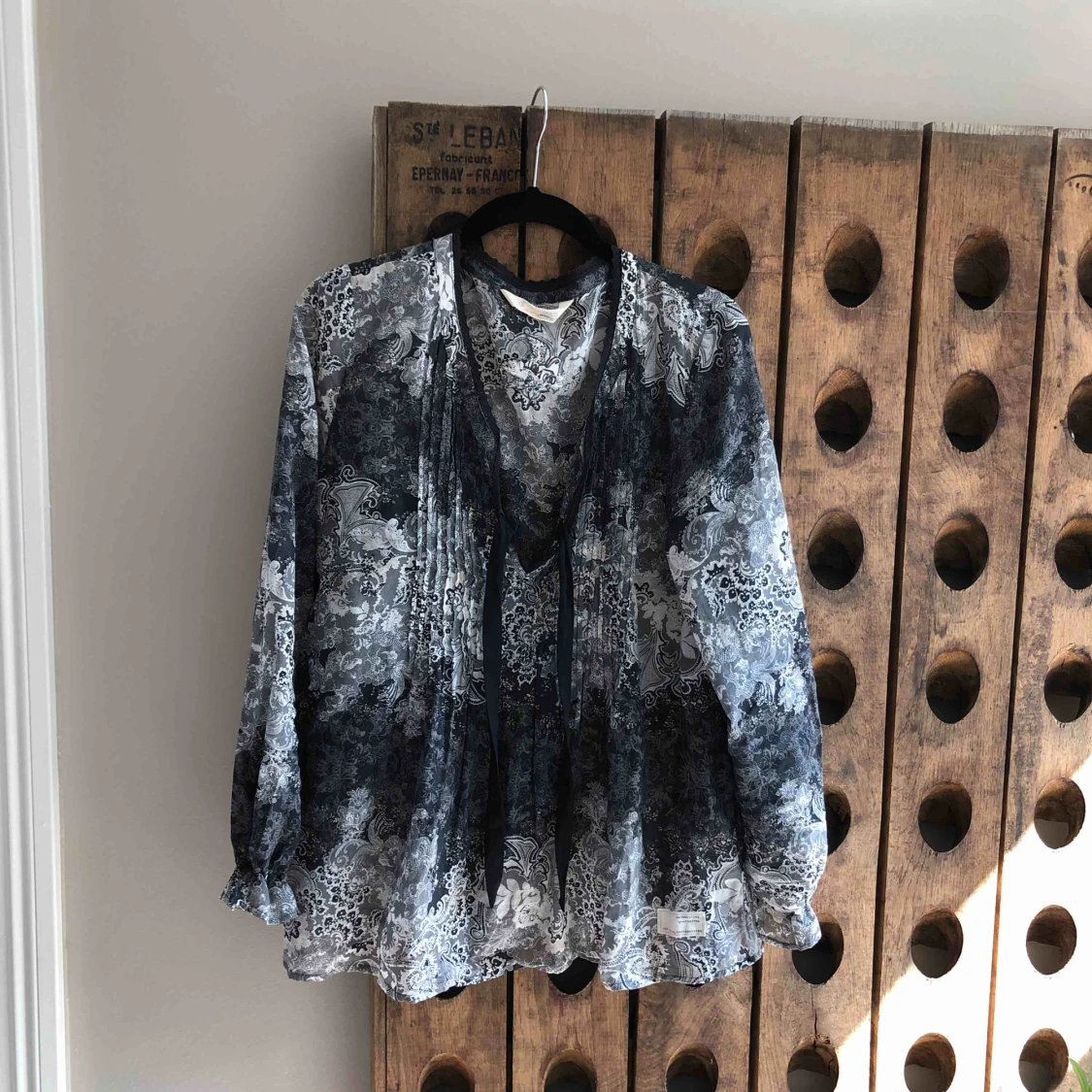 Tunn blus i snyggt svart/grått mönster från OssMolly stl M Använd men i fint skick