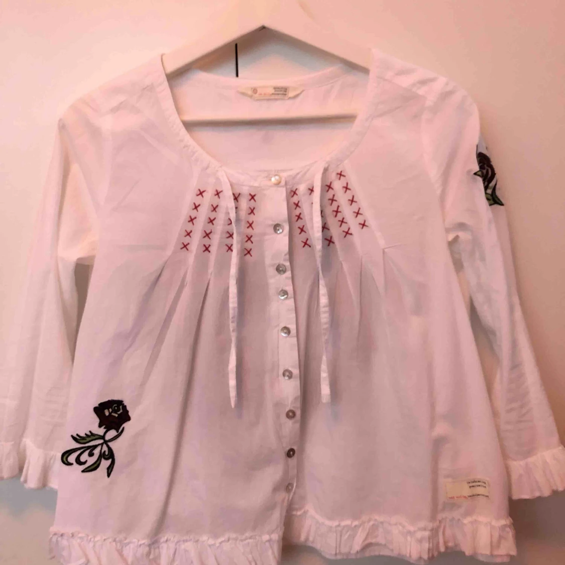 Söt, vit Odd Molly blus med många detaljer. Broderier på både fram- och baksida samt ärmar och knappar framtill. Ärmarna är trekvarts och har volanger i slutet.