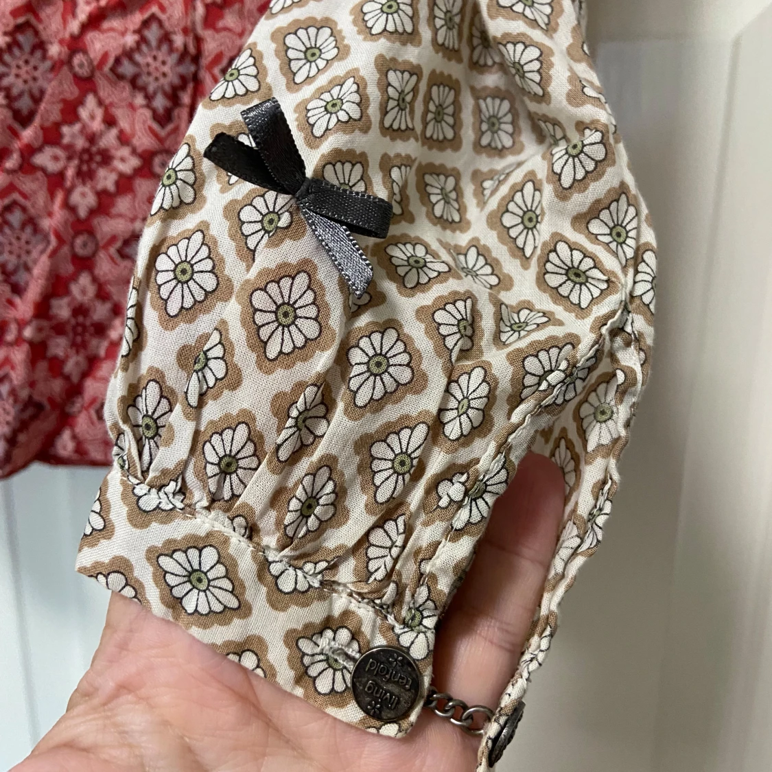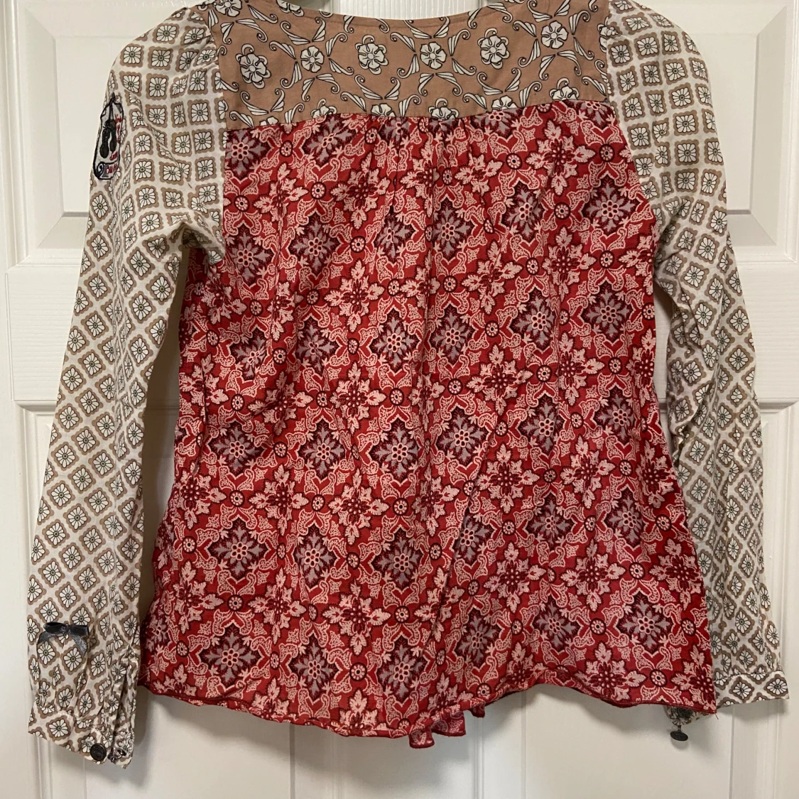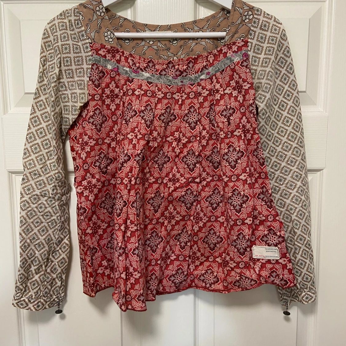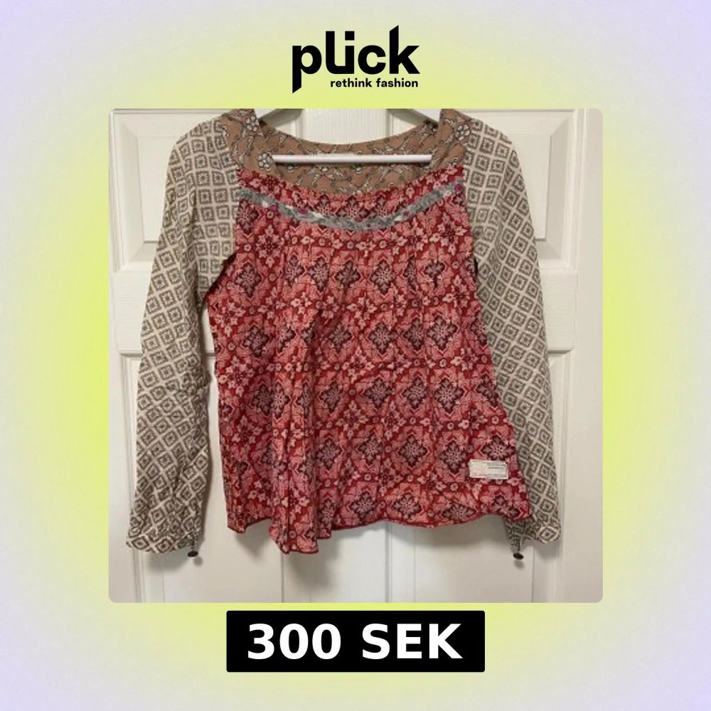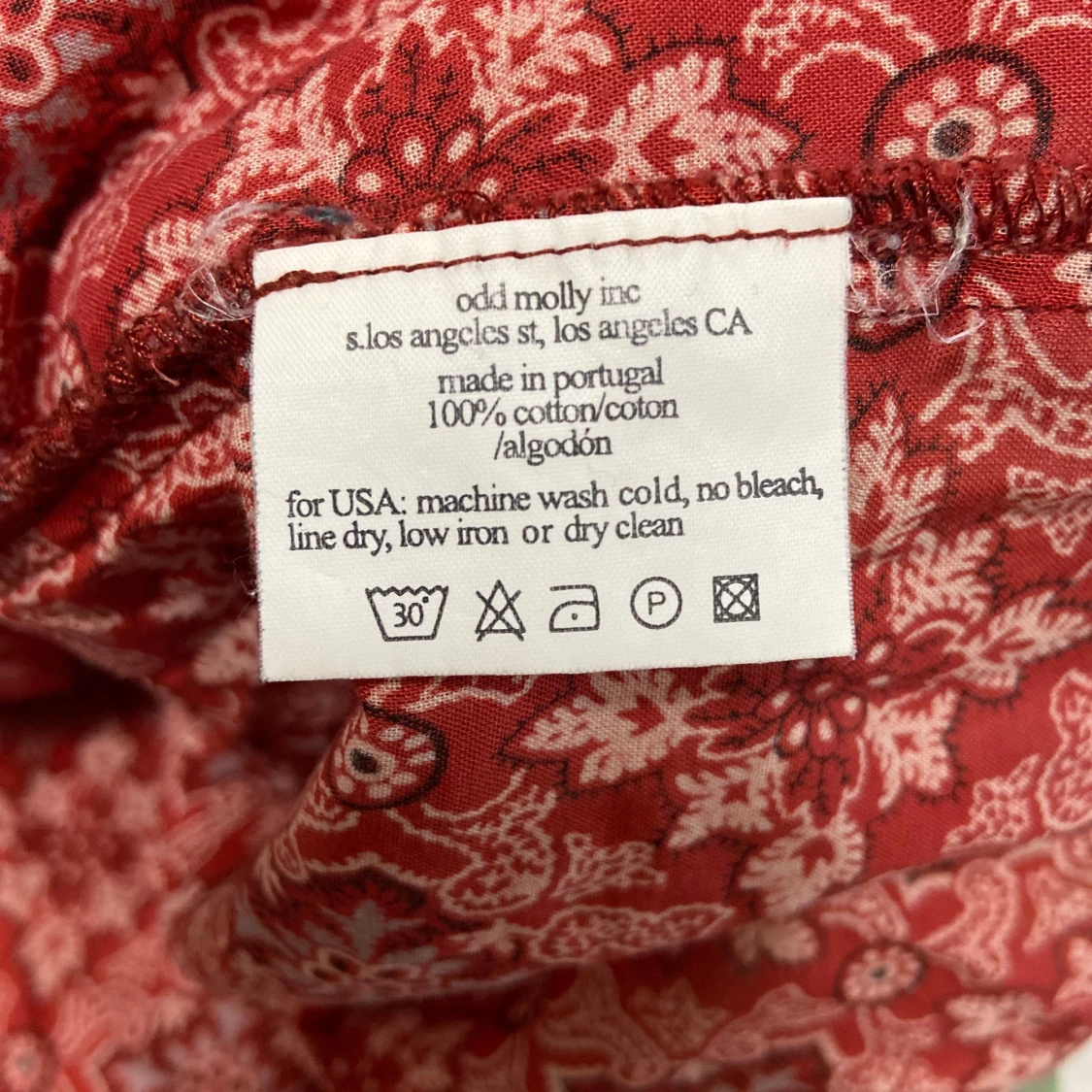 Helt ny! Endast använd en gång. Absolut nyskick!Supersöt blus från Odd Molly med mixade mönster i rött, beige och vitt. Långärmad modell med blommiga detaljer, liten svart rosett vid ärmslut och rundad halsringning. Luftig och skön i bomull, perfekt för dig som gillar unika plagg med boho-vibe.