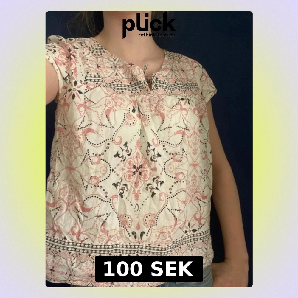 Söt blus i ljus bomull med rosa och svarta orientaliska mönster. Blusen har rund halsringning med liten knytning framtill och korta ärmar. Passar perfekt till jeans eller kjol för en avslappnad look.💞🪽