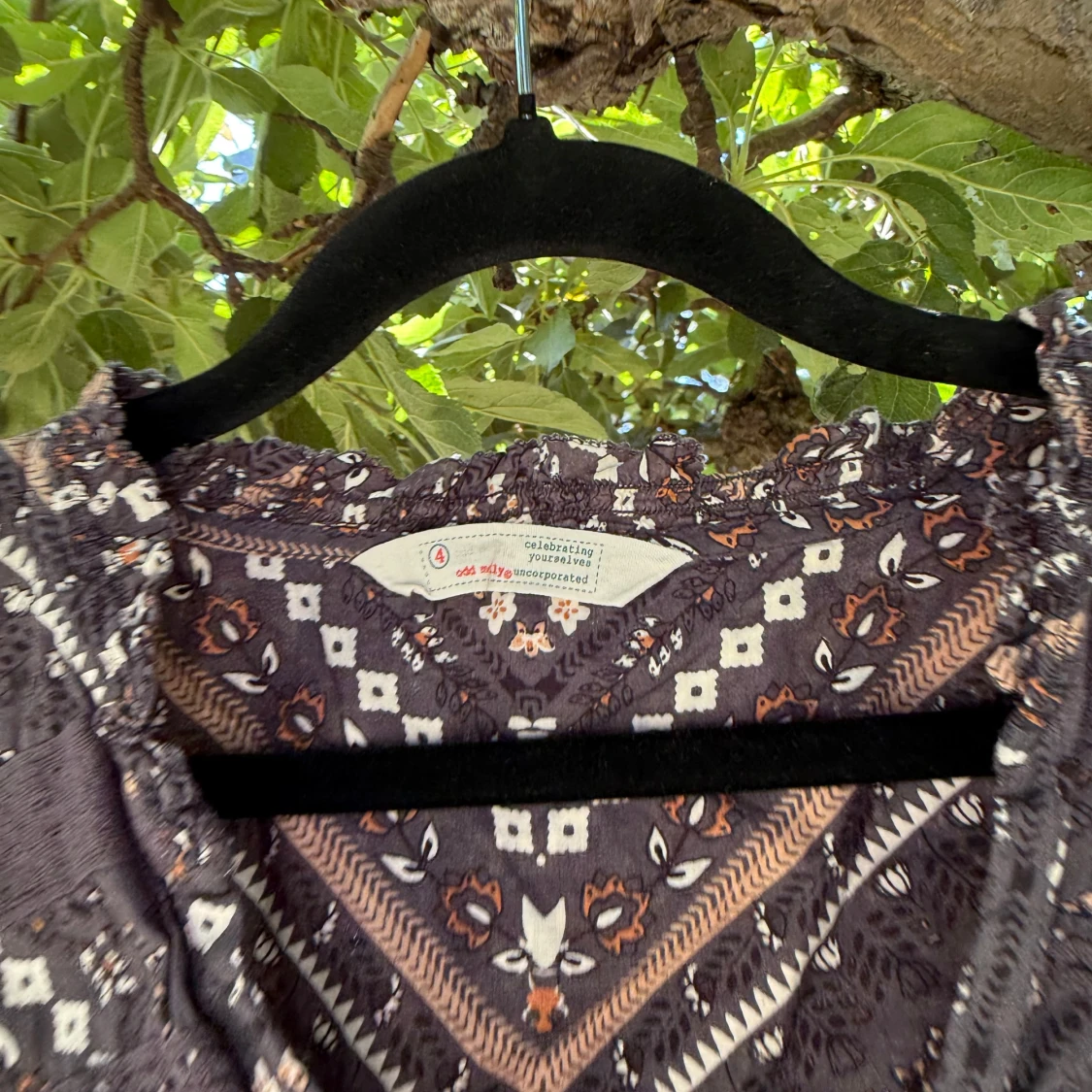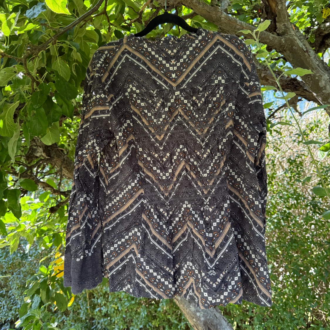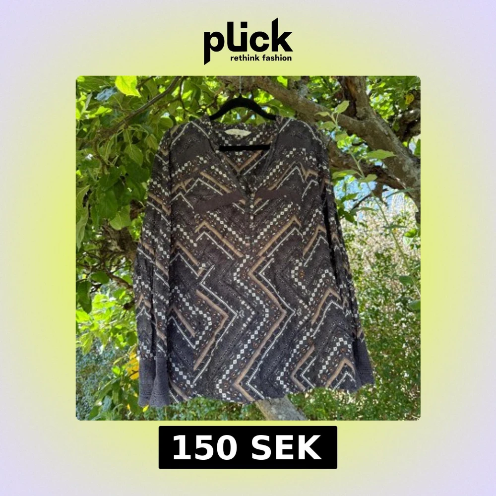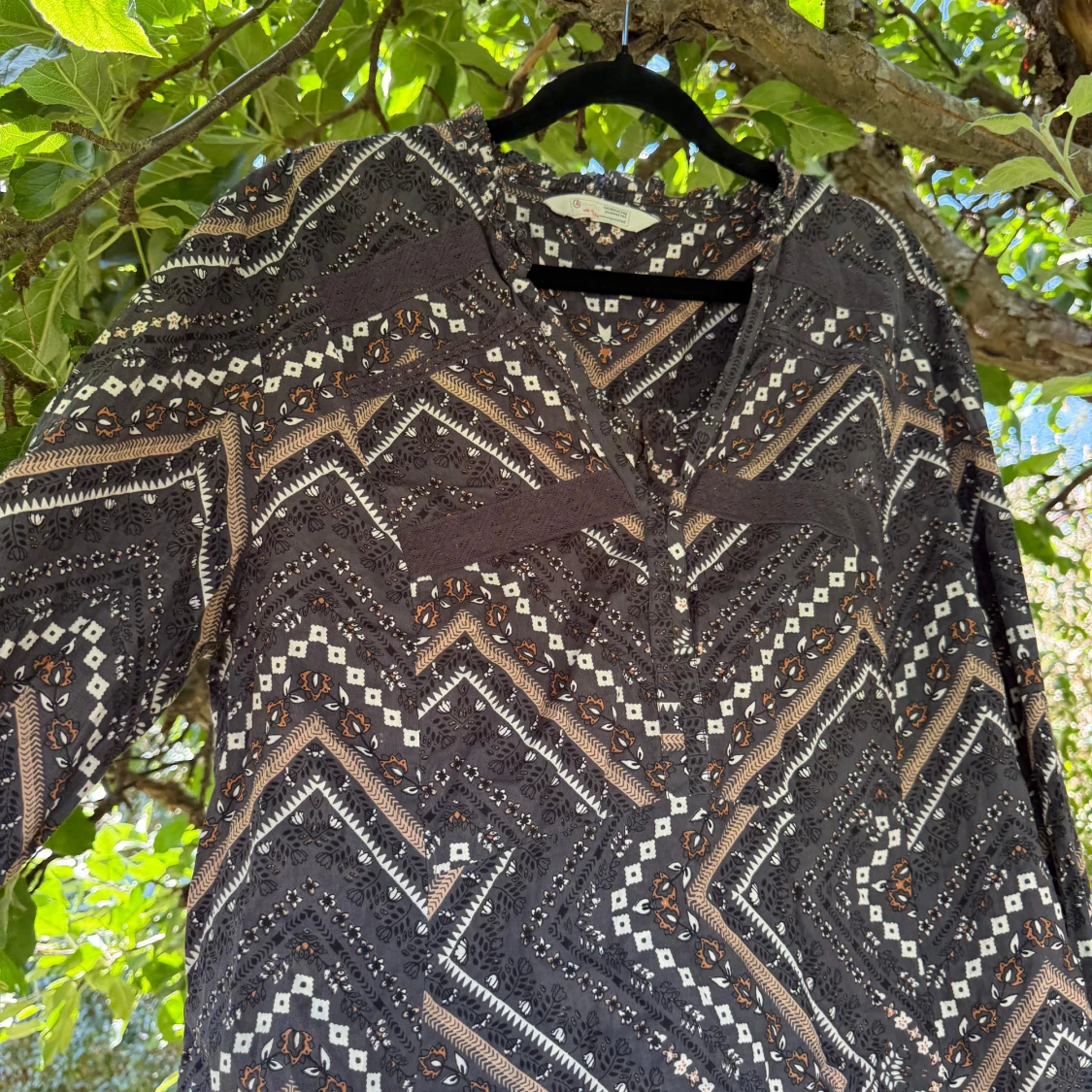 Supersnygg långärmad skjorta från Odd Molly med bohemiskt mönster i grått, beige, brun och vit. Blusen har spetsdetaljer vid ärmslut och bröst, samt v-ringad hals. Tillverkad i mjuk bomull, perfekt för dig som gillar unika detaljer och coola prints. Storlek 4 som enligt deras storleksguide motsvarar en storlek L/XL, men jag tycker denna modell är liten i storlek. Mycket fint skick, jag hittar inga synliga anmärkningar eller defekter.