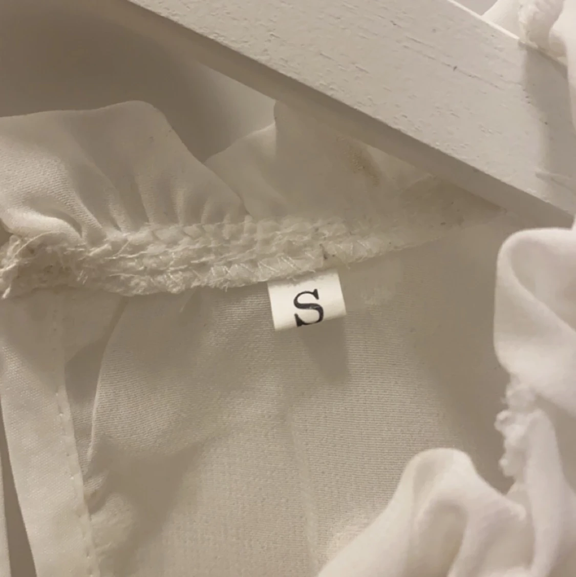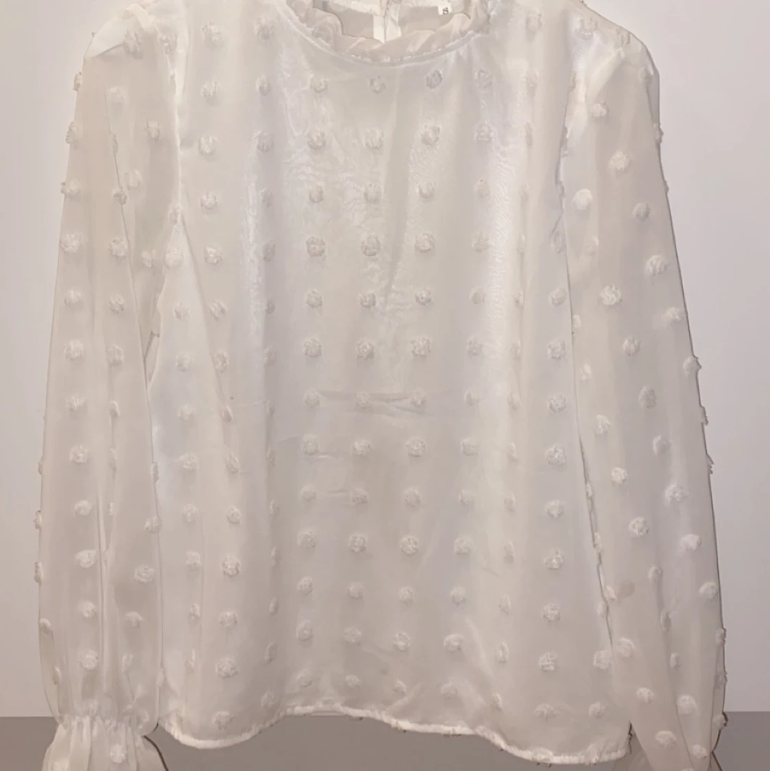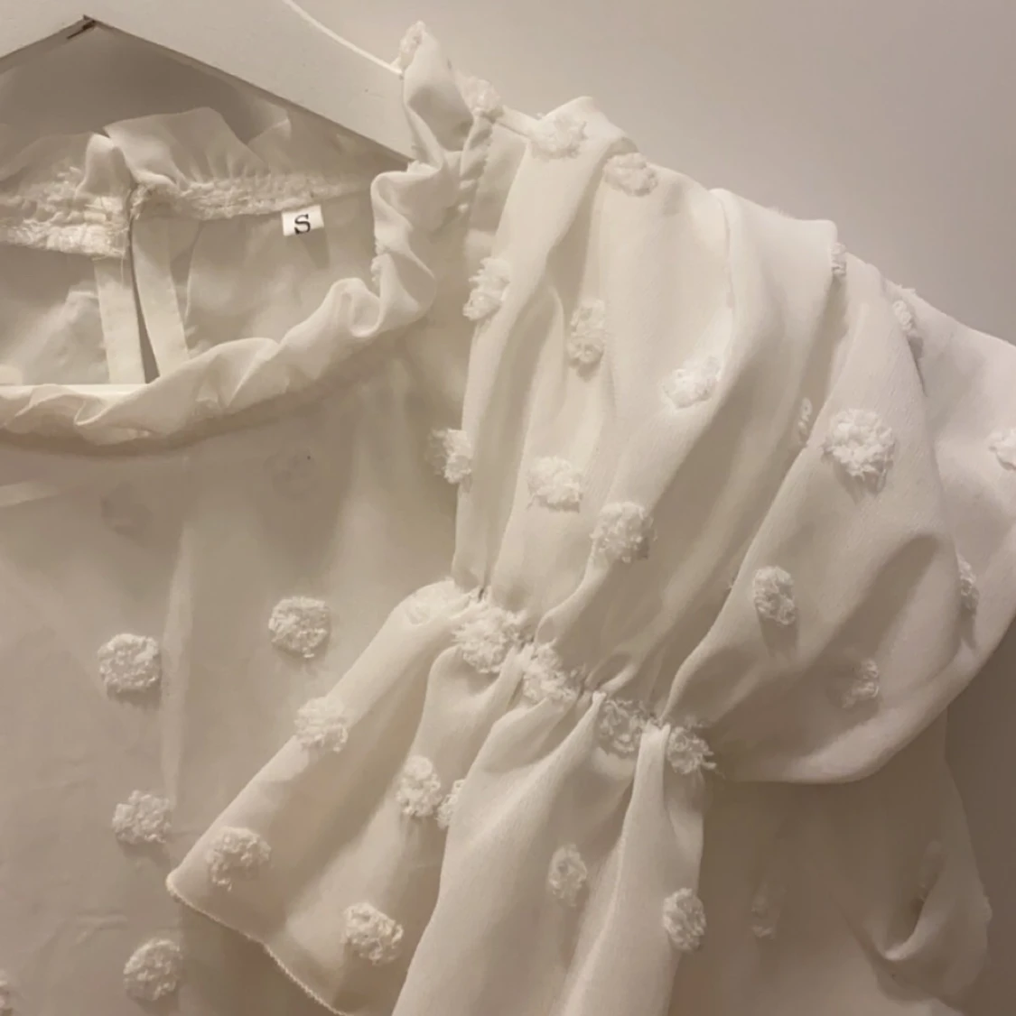 Vit ”prickig” blus med fina ärmar och urringning. Storlek S.
