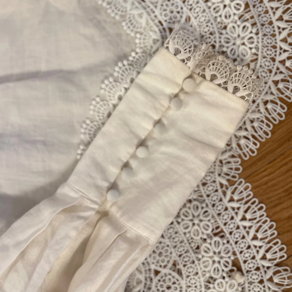 Créme vit blus med vackra spetsdetaljer och puffärmar. Klädda knappar vid ärmsluten och dekorativa broderier. Med knytning där bak Ger en söt, bohemisk eller romantisk look – perfekt till både jeans och kjol! Använd få gånger, i mycket fint skick. Material: Rami (naturmaterial) Nypris: ca 1000kr