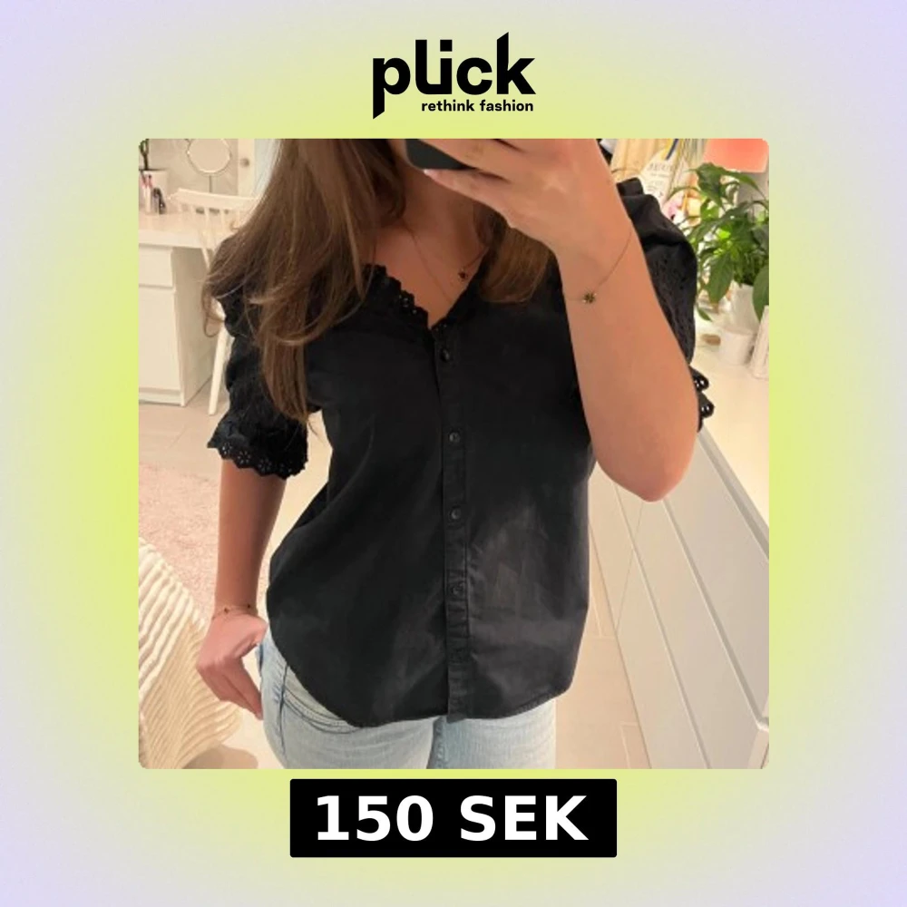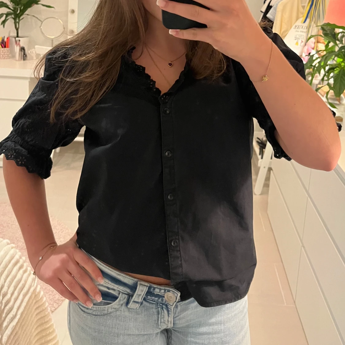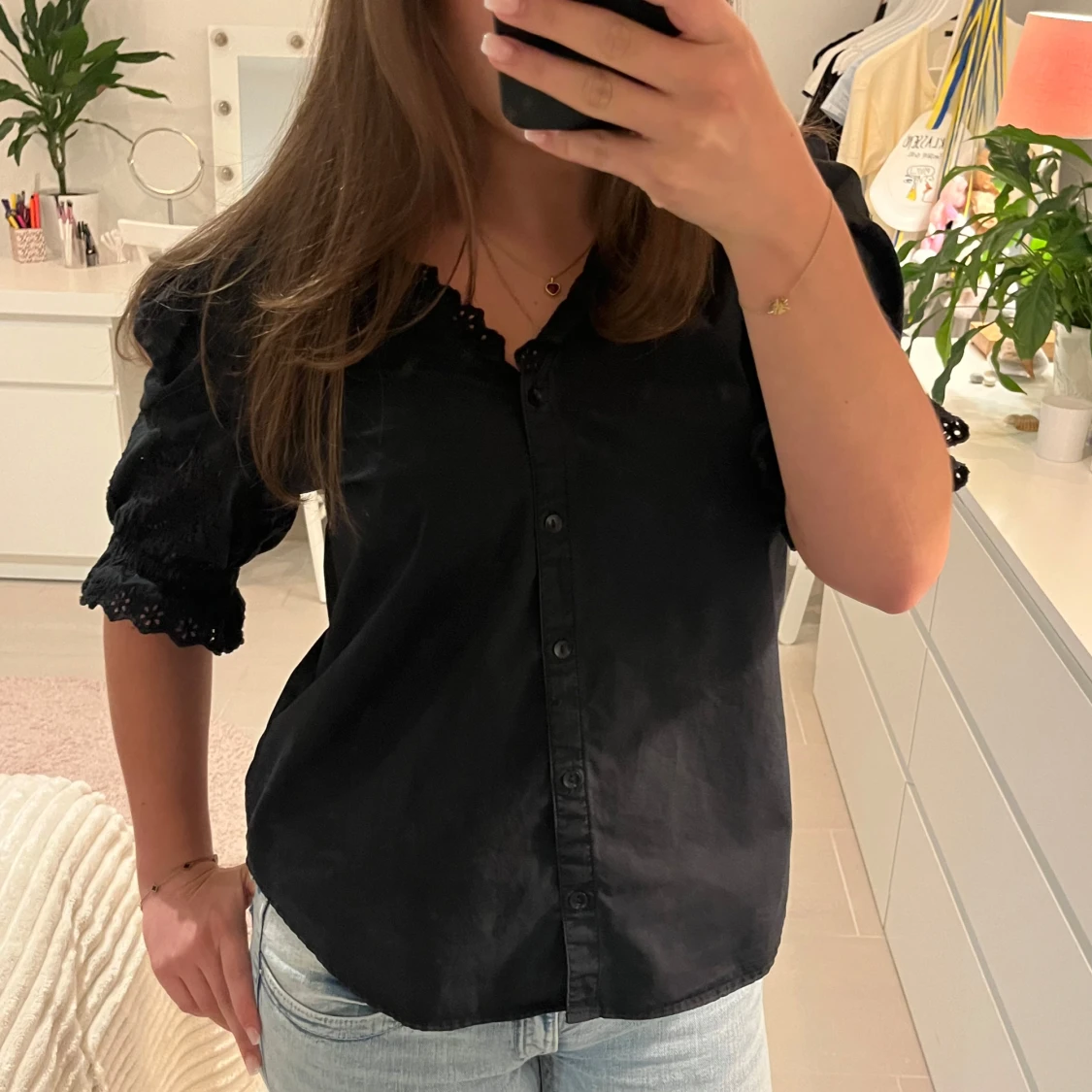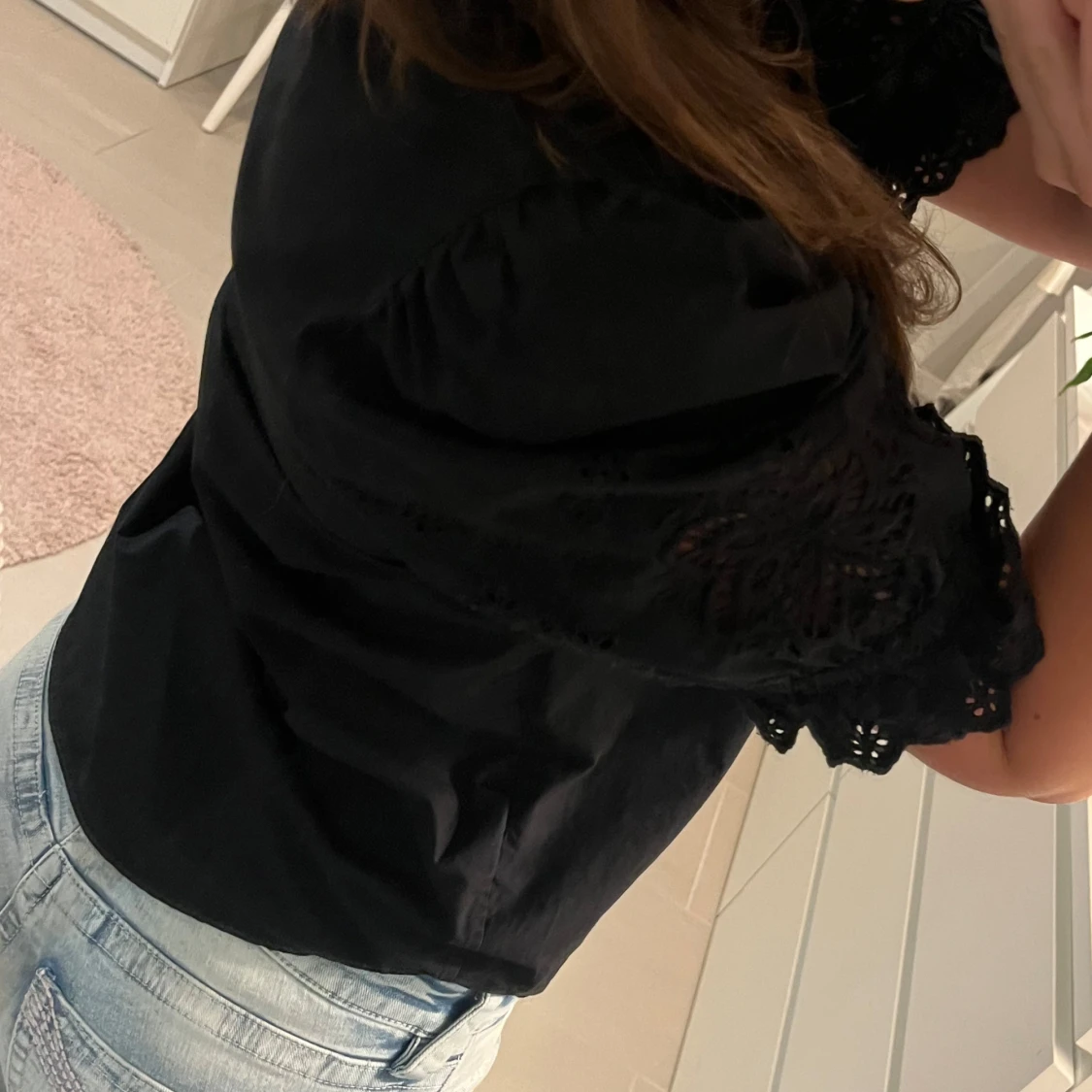 Svart blus med knappar framtill och v-ringning. Ärmarna är halvlånga med fina spetsdetaljer och lätt puff. Blusen har en feminin och stilren look, perfekt till jeans eller kjol. Storlek 40 skulle säga att den passar XS-M.
