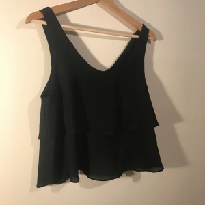 Black crop top ruffled blouse. The back of the blouse is really pretty. The tag says M but since it’s a crop top it fits like a normal blouse as I wear a small.