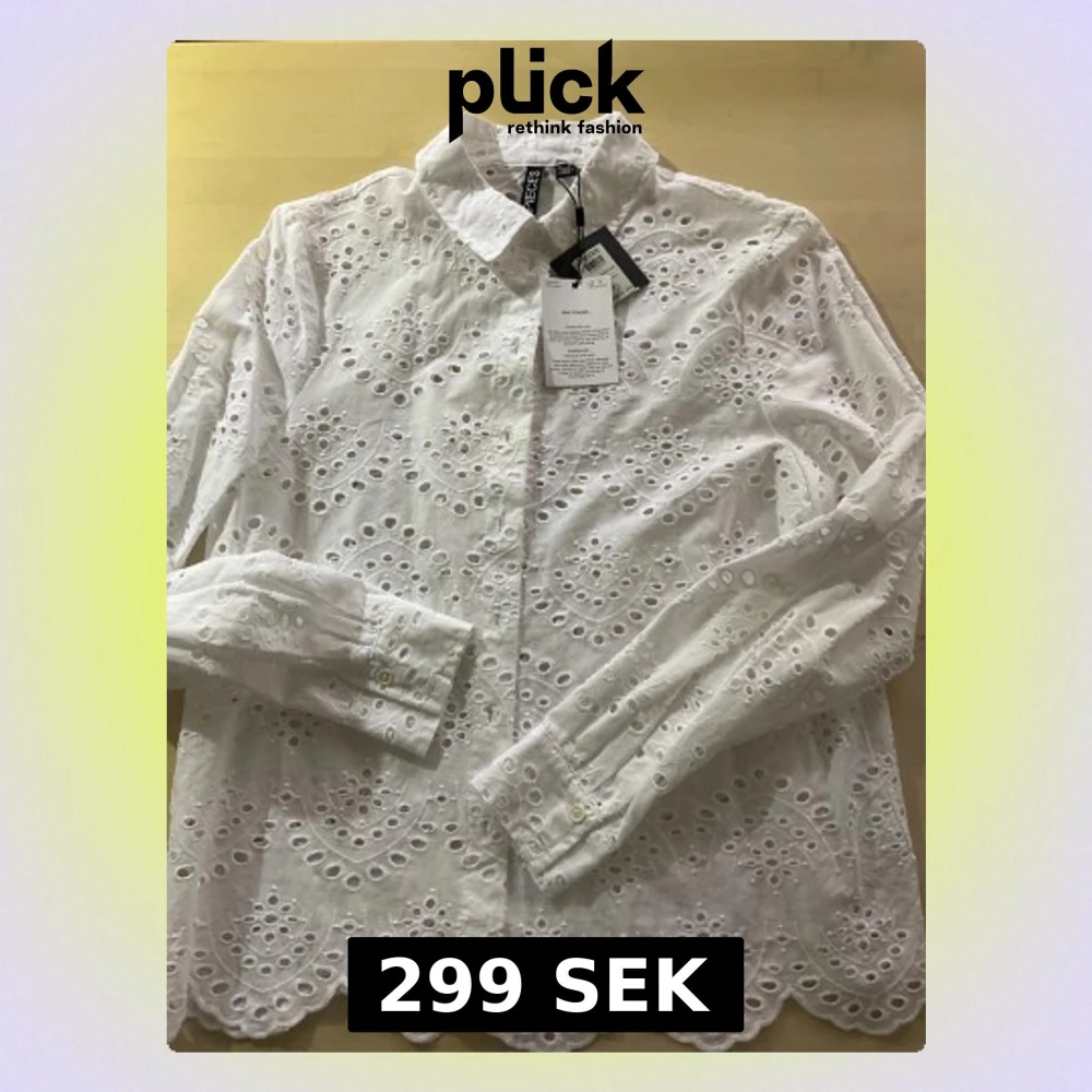 Supersnygg vit skjorta från Pieces i 100% bomull med broderade detaljer och hålmönster. Skjortan har klassisk krage, knappar framtill och långärmade ärmar. Den har en scallopad kant nedtill som ger en extra cool touch. Perfekt för dig som gillar unika plagg med mycket detaljer. Originalpris: 449 kr.
