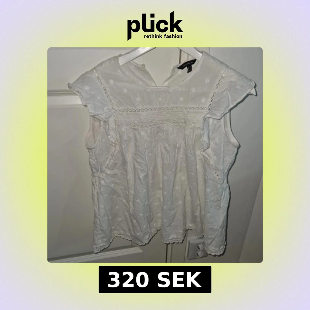 Säljer en söt vit blus från Cortefiel med prickigt mönster och spetsdetaljer. Blusen är ärmlös och har en luftig passform, perfekt för varma dagar. Den har fina volanger vid ärmhålen och en rund halsringning. Passar mig som har stl S/Xs