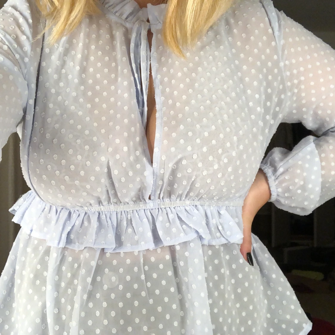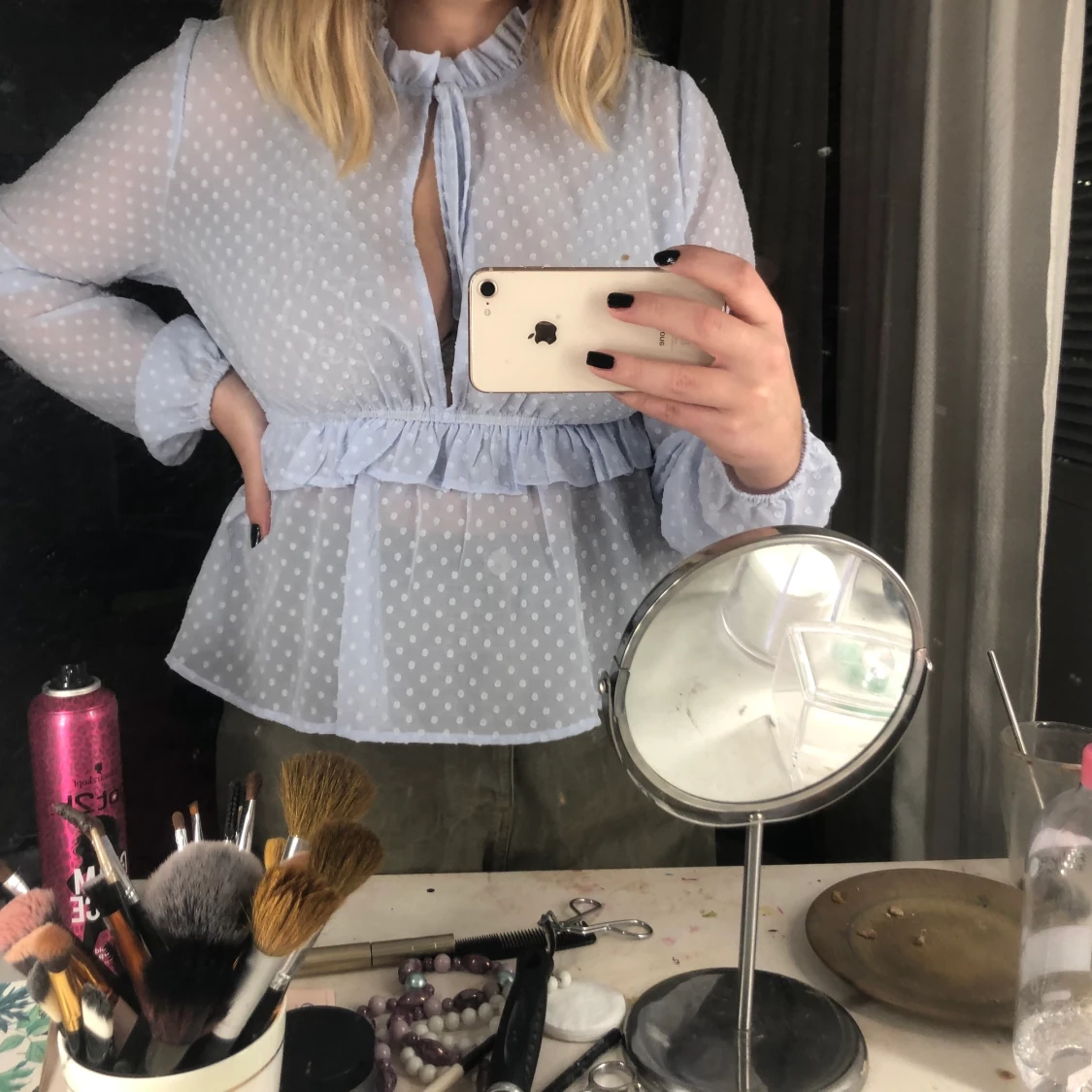 Ljusblå, prickig, mesh blus från bil bok. Den är i stort sätt aldrig använd och är i ett jättefint skick! Storleken är L, men även M fungerar. #blus #top #ljusblå #mesh #prickig Nypris: 250kr Kostnad: 50+frakt