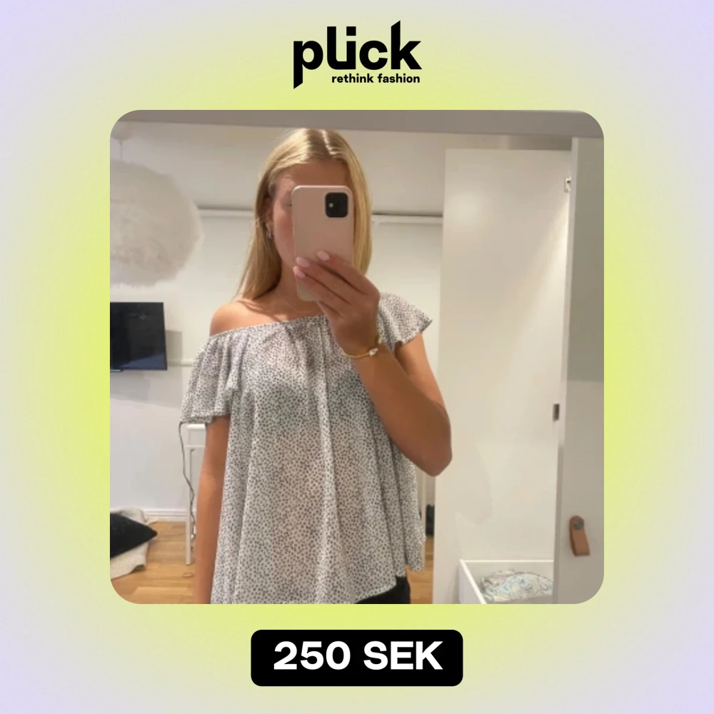 Jättegullig prickig blus. Den säljs inte längre och går därmed inte att få tag i. Man kan både ha den one shulder eller över båda axlarna.❤️
