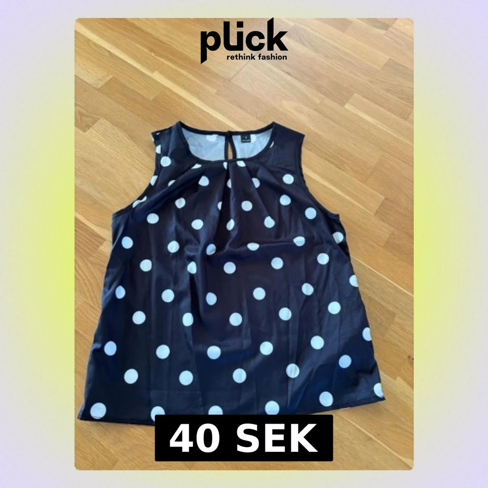 Snygg och klassisk blus med vita prickar. Ärmlös blus med fin detalj vid halsen. Lätt och skönt material.
