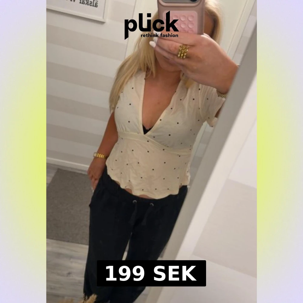Säljer en söt ljusbeige omlottblus från Gina Tricot i storlek S. Blusen har svarta prickar, korta ärmar och knytband i ryggen. V-ringad och med lätt volang i nederkant. Perfekt för dig som gillar en feminin och trendig look.