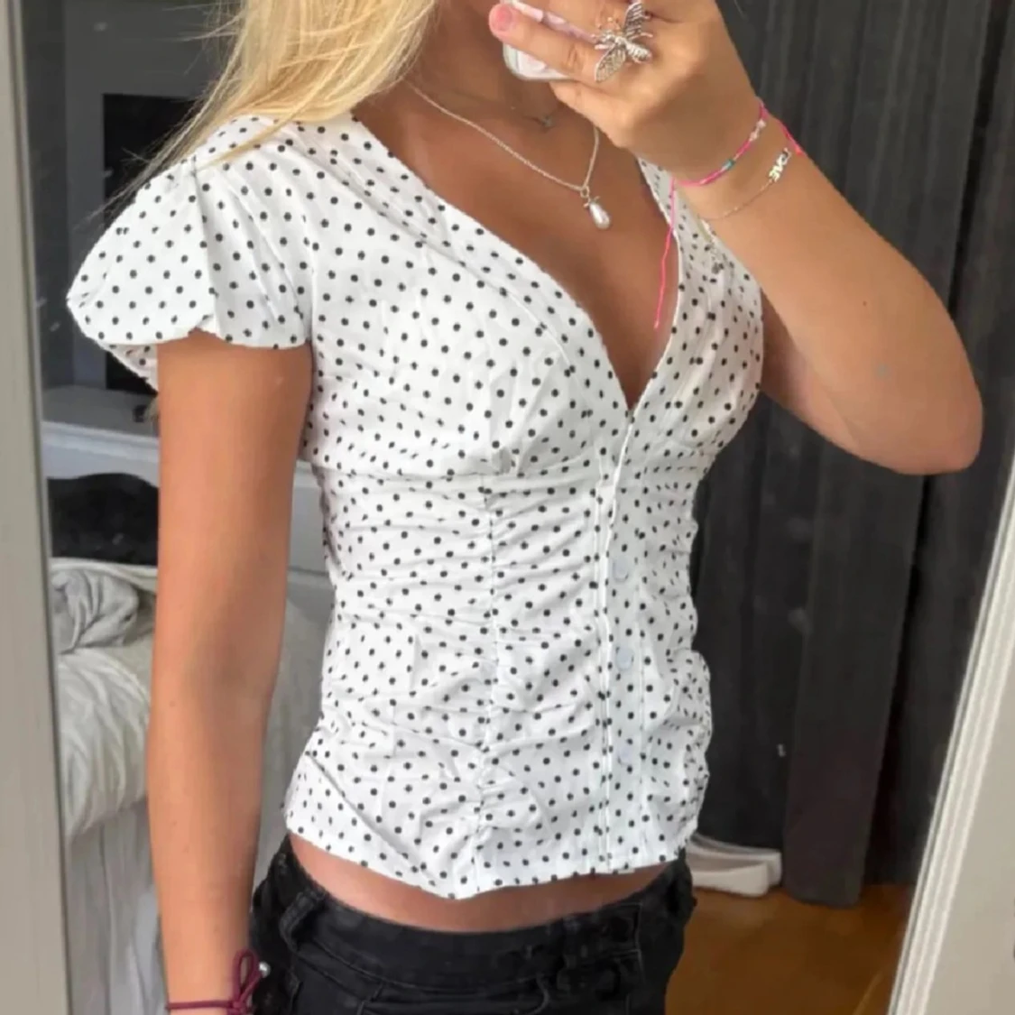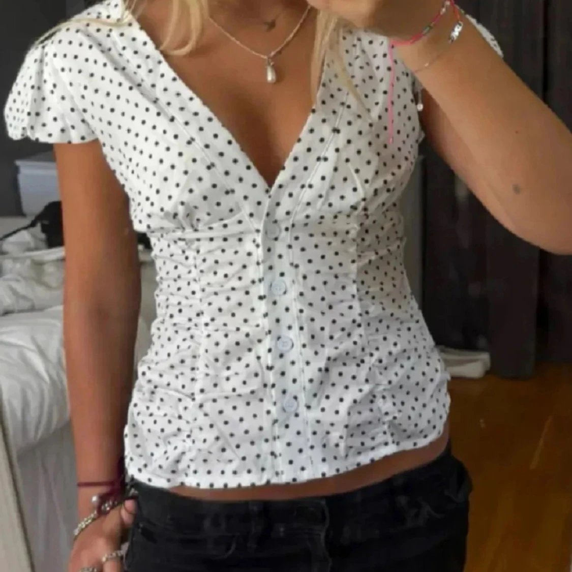 Jättesöt prickig blus/topp sitter tajtare i midjan 💞💞köpt på plick men aldrig använd (endast testad)