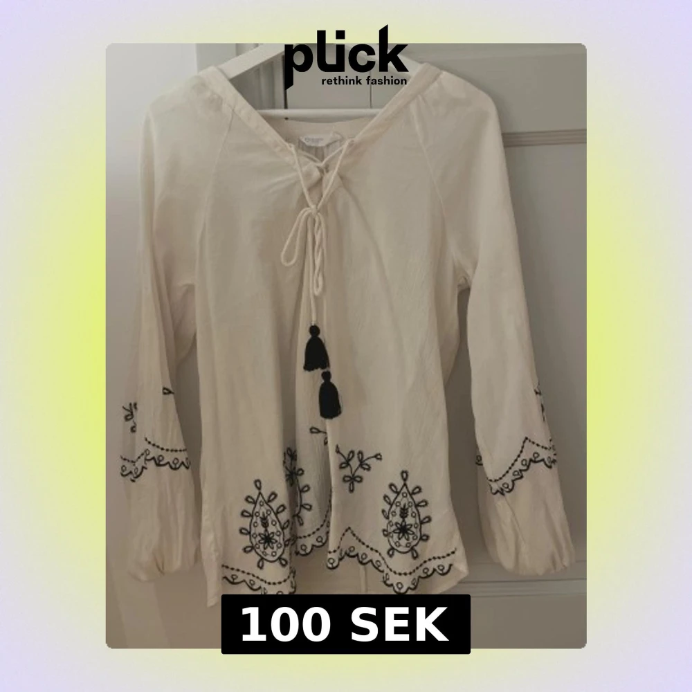 Säljer en bohemisk vit blus från primark med svart broderi och snörning framtill. Blusen har långa, luftiga ärmar och dekorativa tofsar vid knytningen. Perfekt för dig som gillar detaljer och en chill stil.
