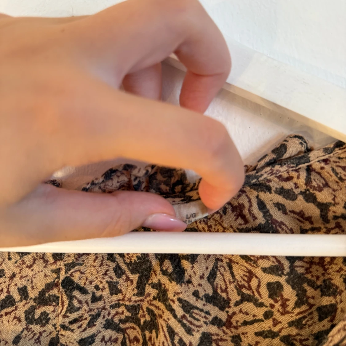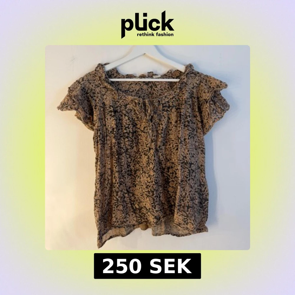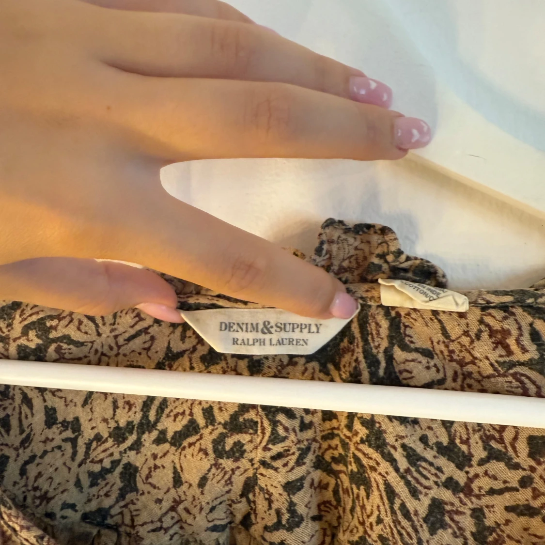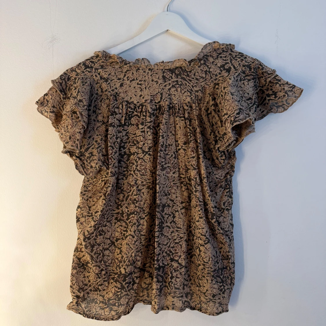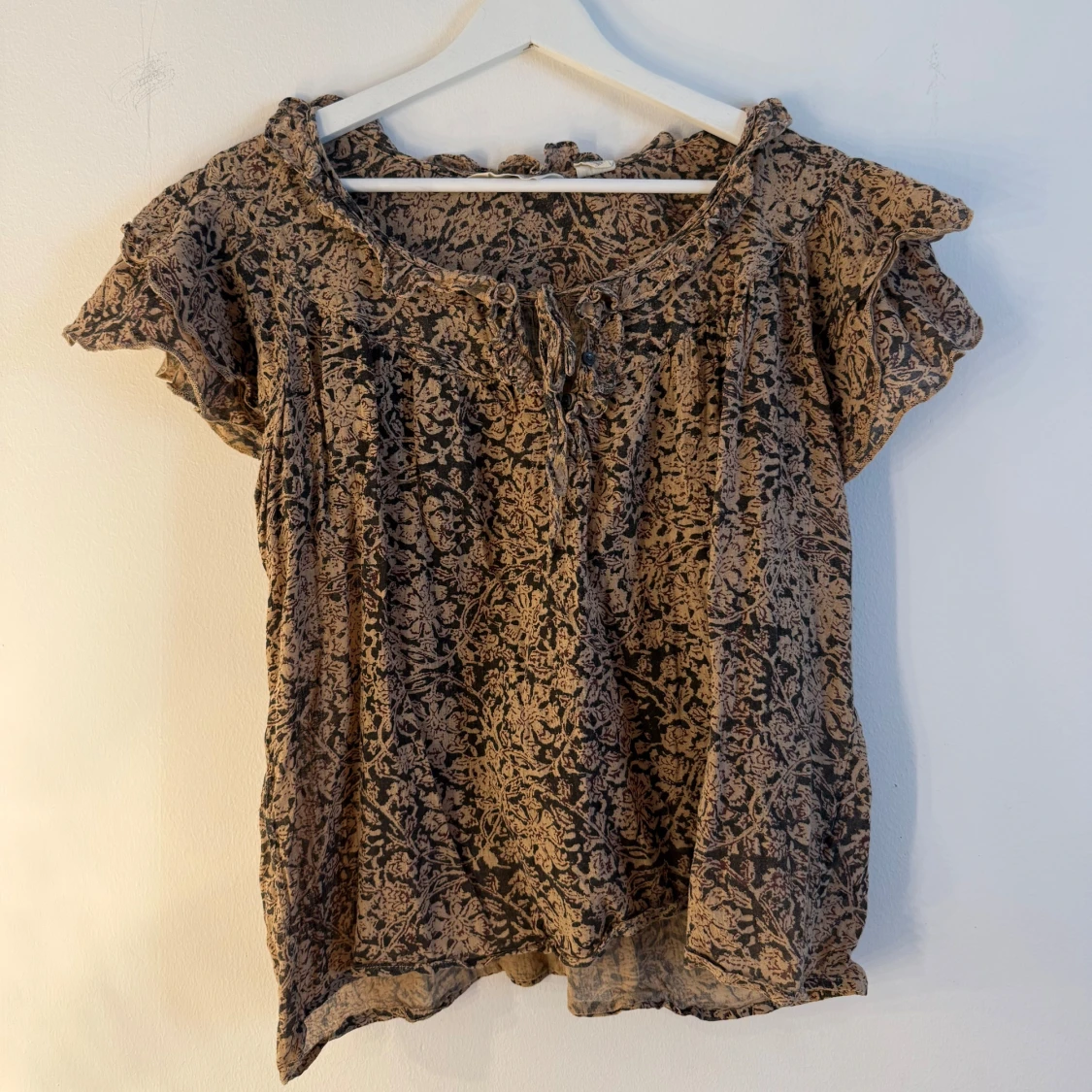 Brun och svart Ralph Lauren mönstrad blus med korta ärmar och rynkad halsringning. Blusen har en avslappnad passform. Storlek L men upplever den mer som en M