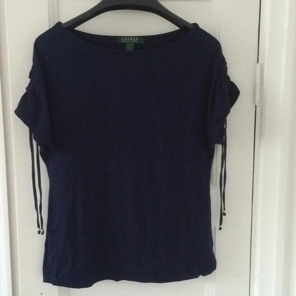 Mörkblå topp ifrån Ralph Lauren. Guldfärgade detaljer, knyt vid axeln. Använd, ok beg. skick.