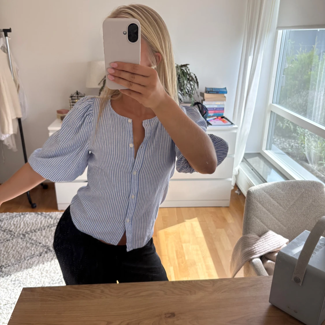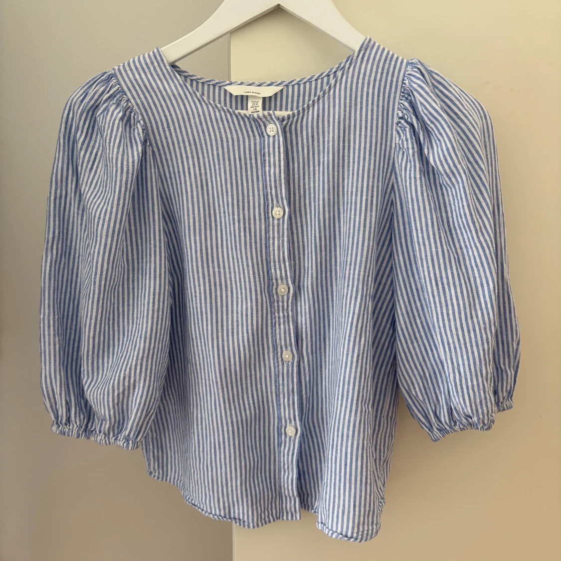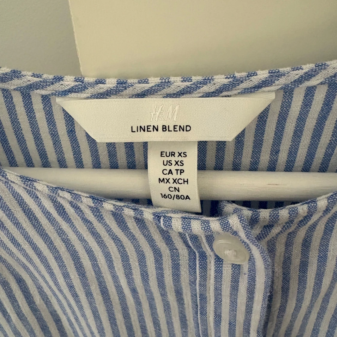 Säljer en vit/blårandig blus från H&M i linne! Aldrig använd men prislappen är av! I strl XS.