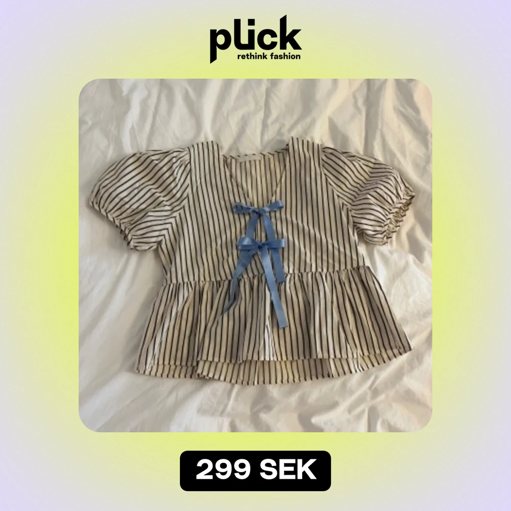 Randig topp med puffärmar och silkesband med rosetter. Ganni-inspirerad. Extremt fin! Jag har bytt ut originalbanden mot blå silkesband för att ge den ett lyft 😍
