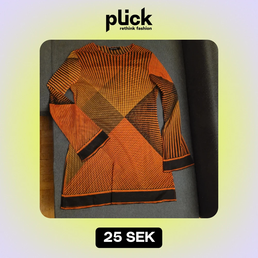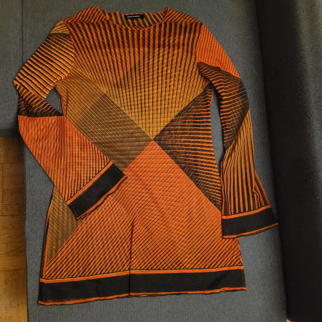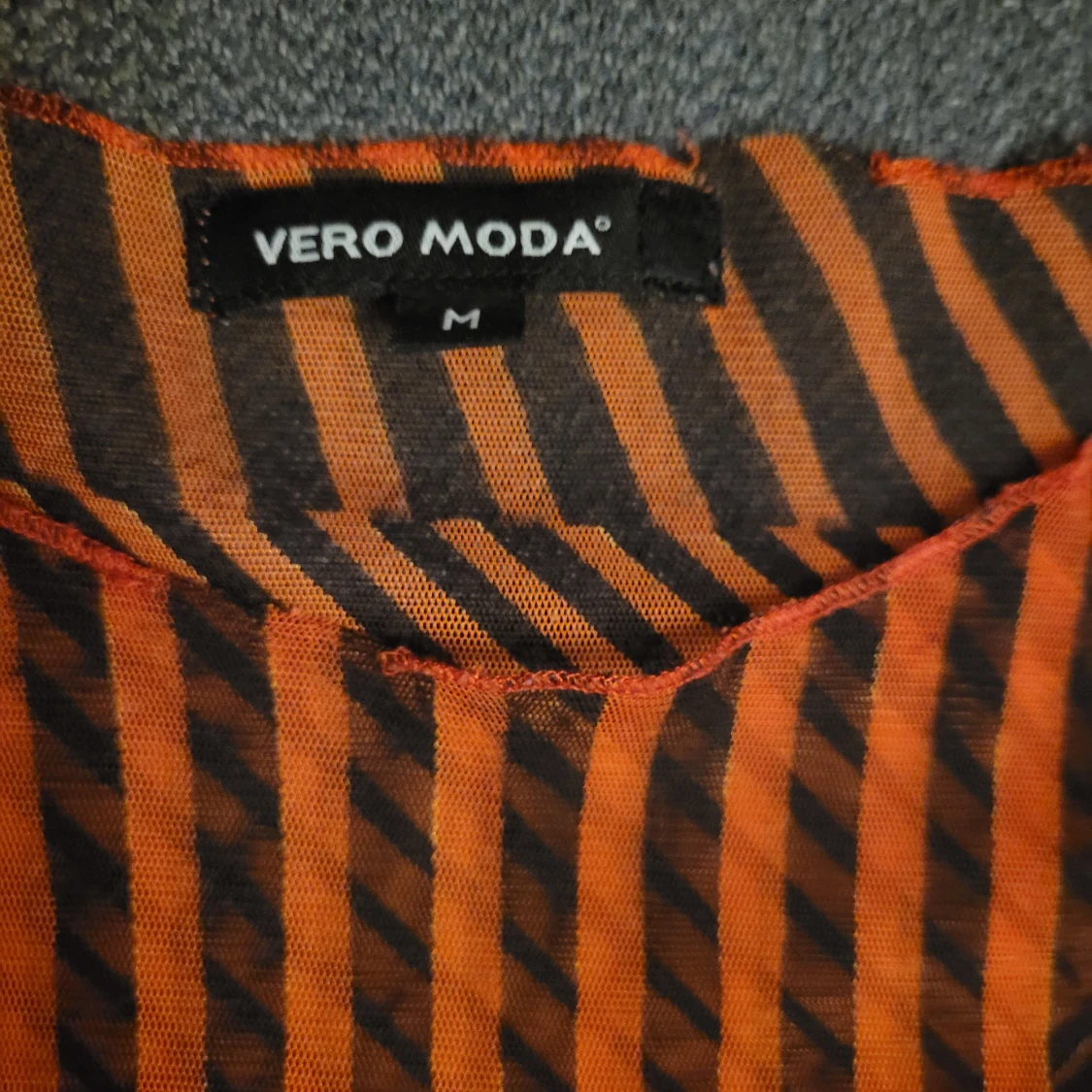 Snygg och unik klänning/tunika från Vero Moda i storlek M. Den har ett coolt randigt mönster i orange och svart med geometriska detaljer. Materialet är tunt och lite genomskinligt.