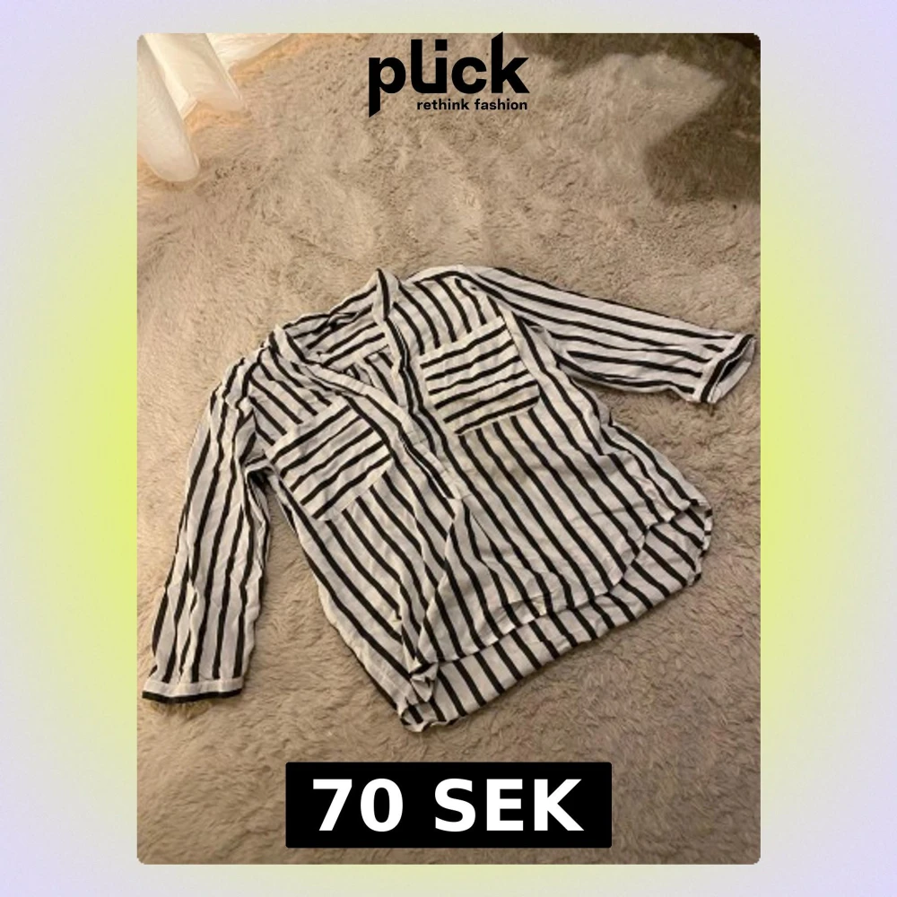 Snygg vit svart randig skjorta, från Vero Moda i storlek XS. Skjortan har två stora bröstfickor, knappar framtill och som slutar på mitten. Materialet är mjukt och fuktigt och skjortan har korta ärmar med små knappar💞