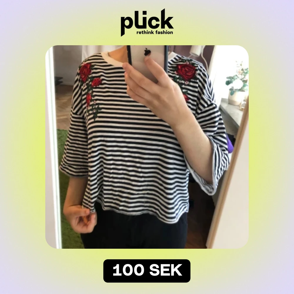 Randig tröja med rosor på. Den är i ett fint skick, men är köpt i två storlekar större än vad jag brukar ha. Jag tror därför den hade suttit bättre på någon som har denna storlek i vanliga fall, om man inte också tycker om over-seize☺️