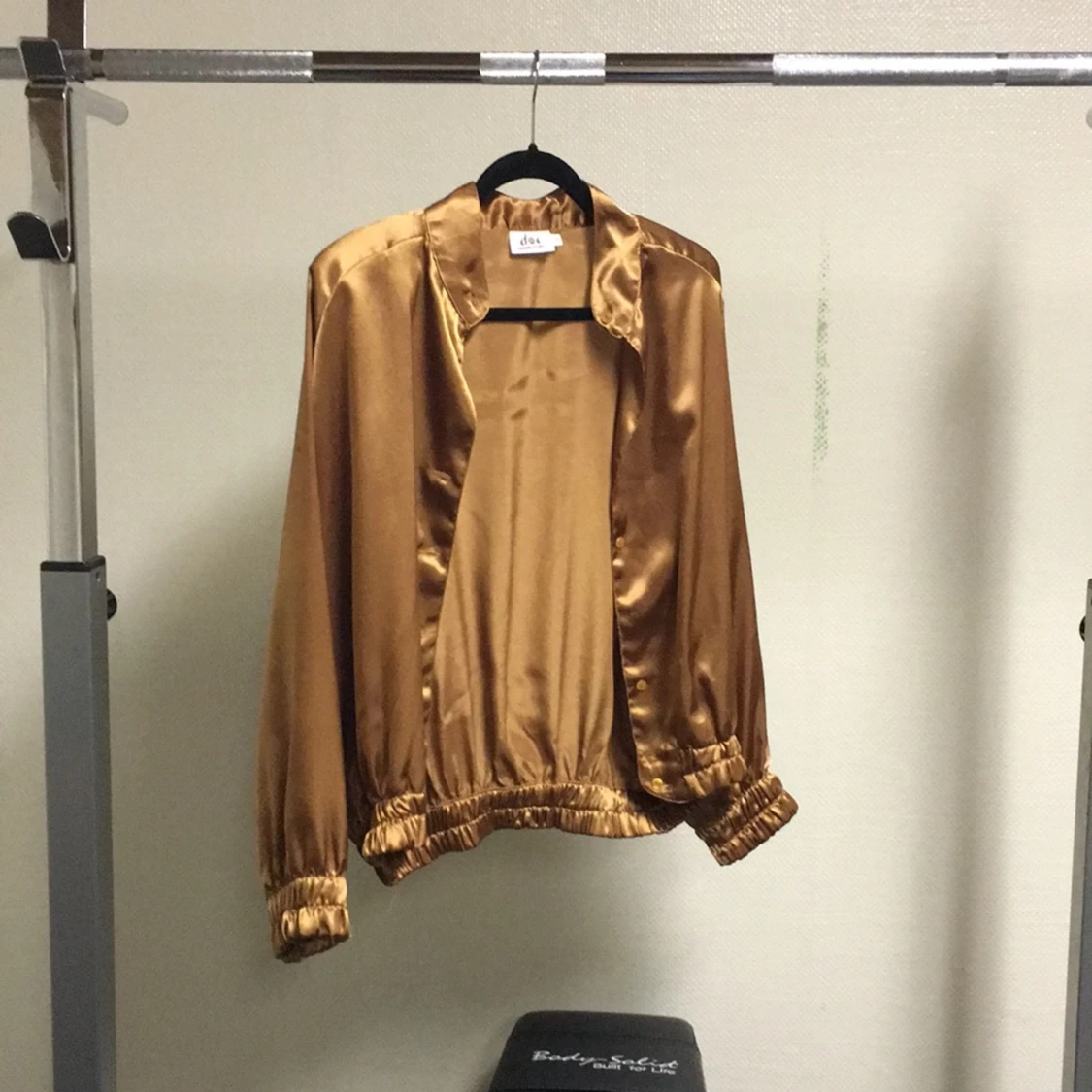Guld/kopparfärgad retro blus med axelvaddar, tre knappar saknas.