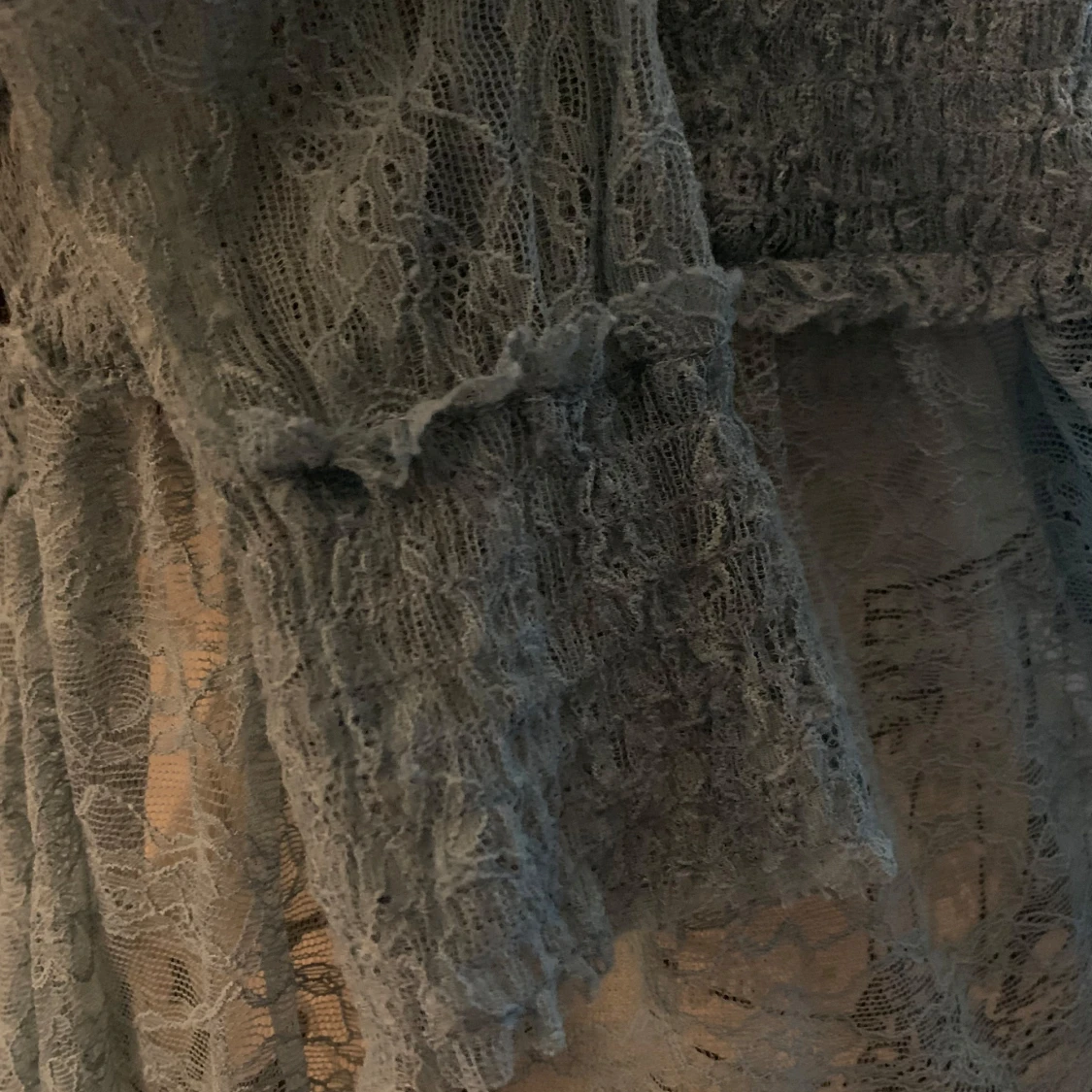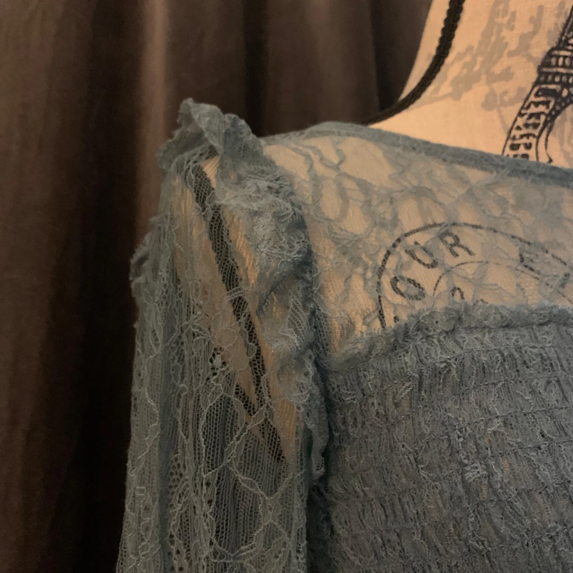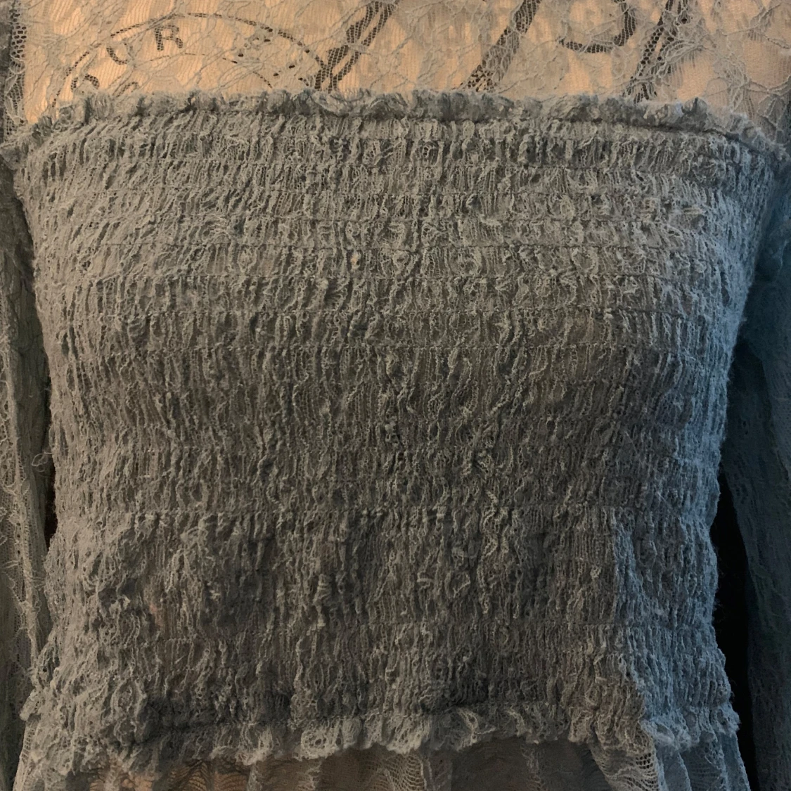 Romantisk ljusblå blus i spets med transparenta långa ärmar och smockad överdel. Blusen har en feminin volangdetalj vid axlarna och är figurnära upptill. Perfekt för dig som gillar en drömmig och unik stil.
