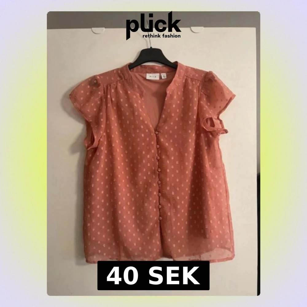 Söt rosa blus från Vila med små prickar i tyget och knappar framtill. Blusen har korta ärmar med lätt puff och är tillverkad i ett tunt, transparent material som ger en luftig känsla. Perfekt för en trendig och avslappnad look.