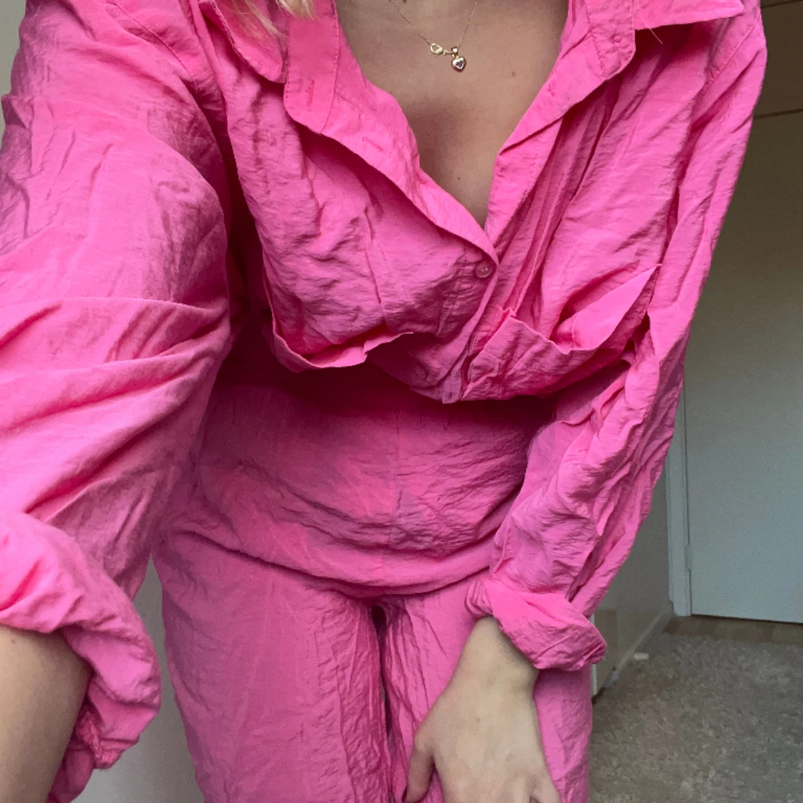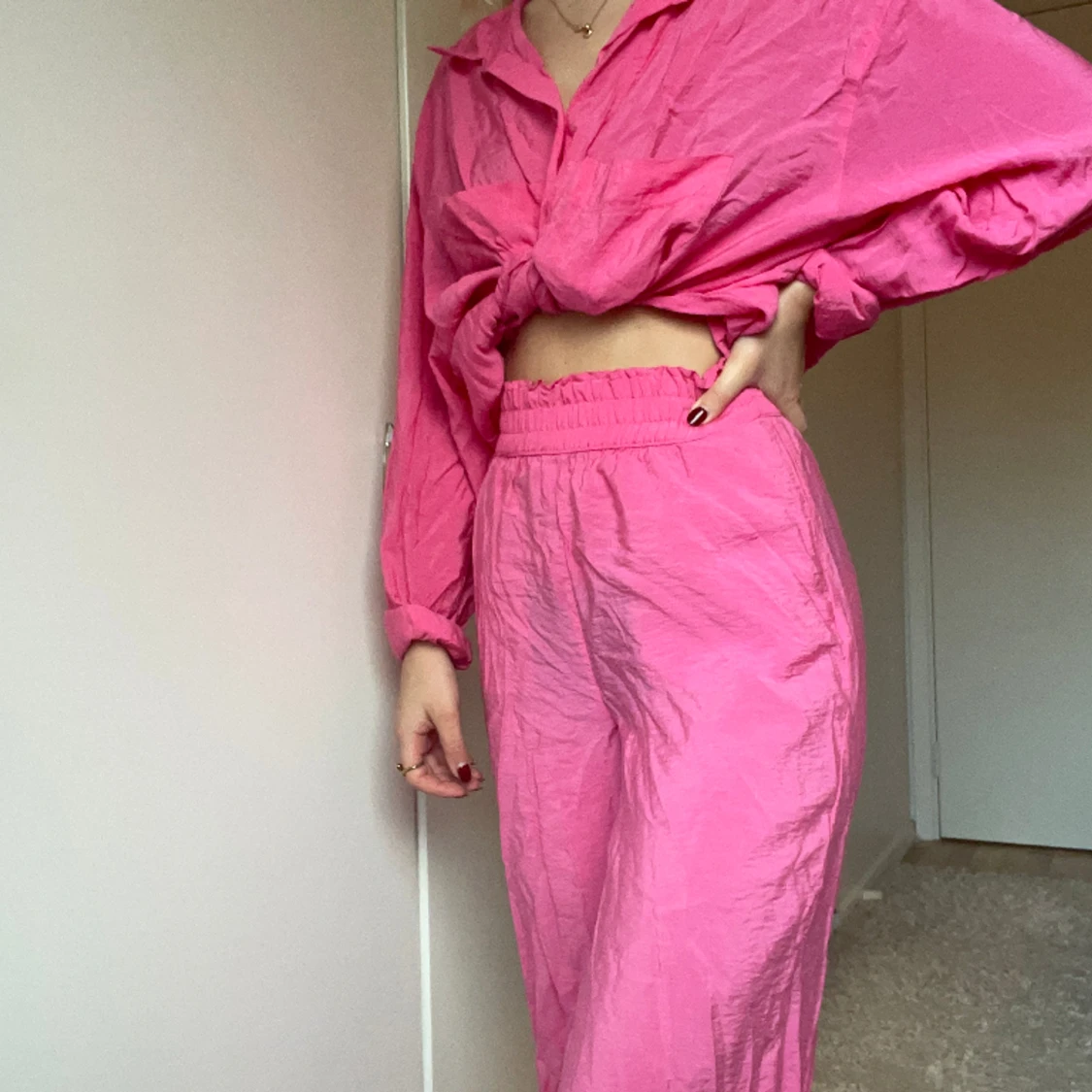 Rosa set från H&M Byxorna är XS (jag är en 34-36) Skjortan är 2XL men omsydd. Sitter om en oversized skjorta. 300kr totalt