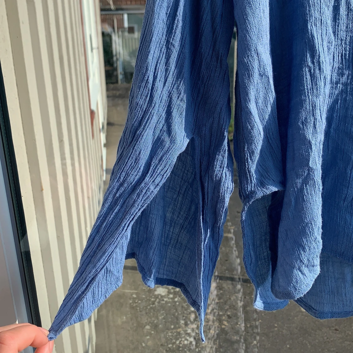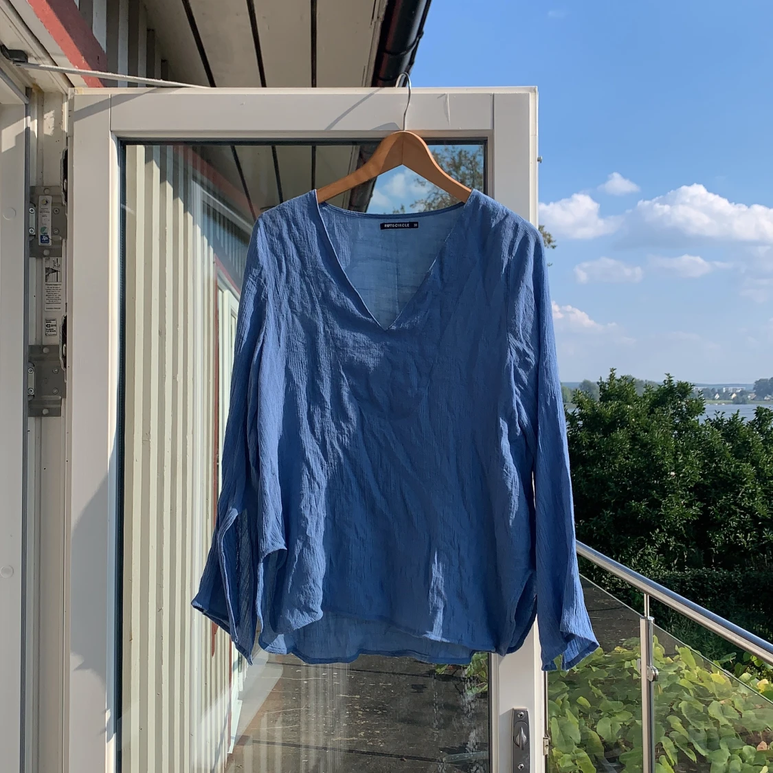 Blå blus med skärning i armen. Relativt använd men i mycket gott skick. Köparen står för frakten.
