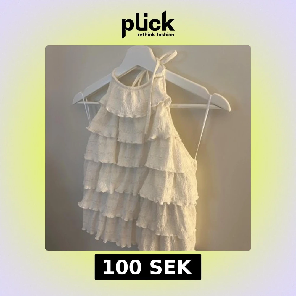 Supersöt vit blus med flera lager volanger och knyt i nacken. Blusen är ärmlös och har en lätt strukturerad bomullskänsla som ger en chill och luftig vibe. Perfekt för sommarens varma dagar och har en riktigt fräsch look.