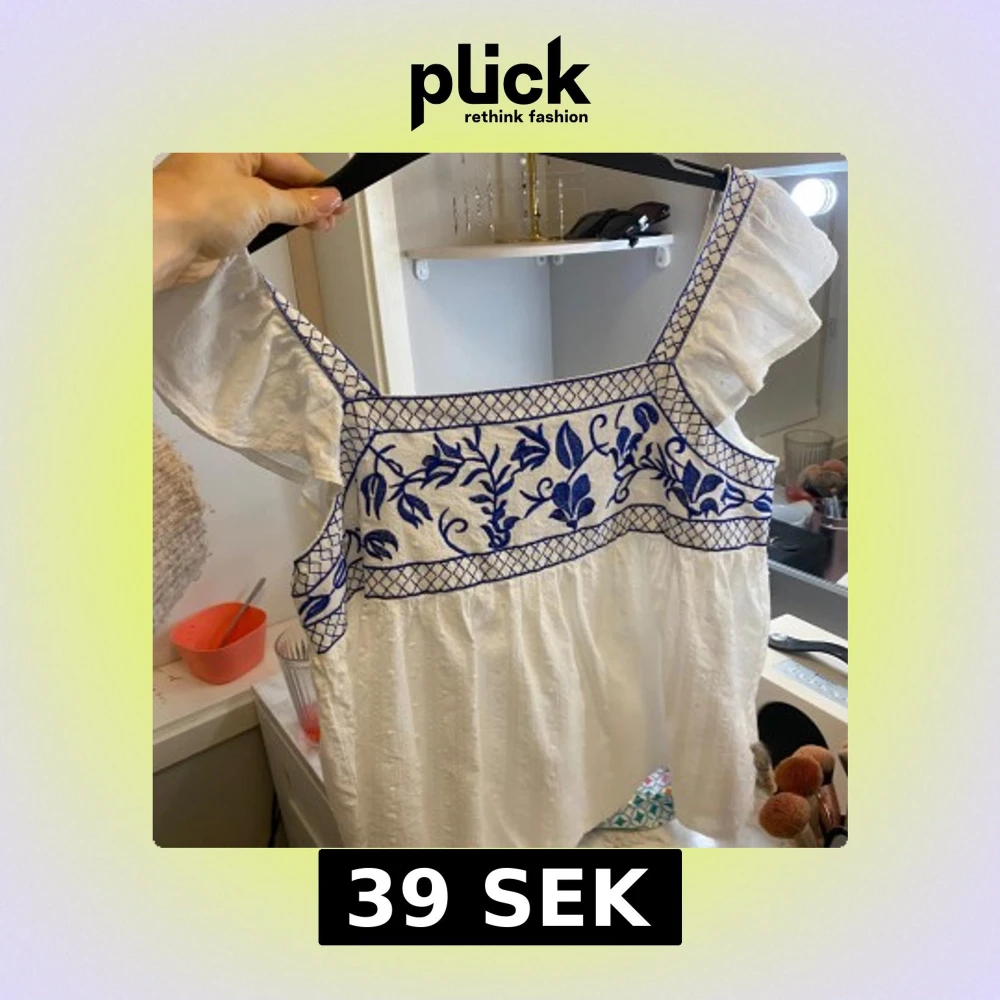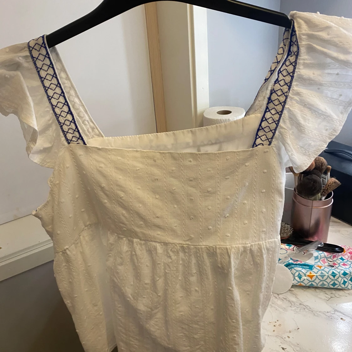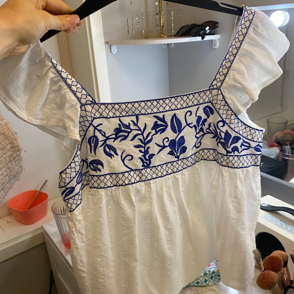 Superfin vit topp med blått broderi över bysten och axelbanden. Toppen har volangärmar och en luftig passform, perfekt för varma dagar. Detaljerad med blommigt mönster.