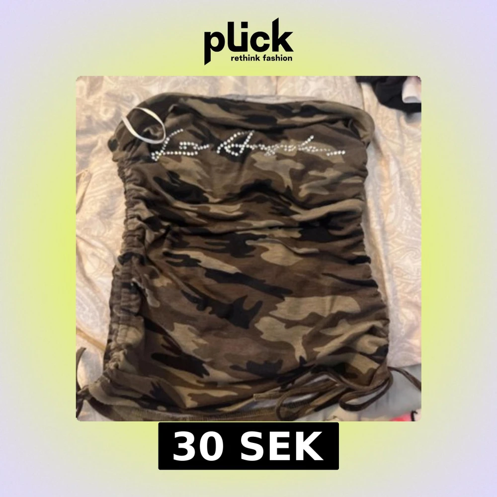 Säljer en tight tubklänning i camouflage-mönster med snörning i sidorna och strassdetaljer framtill. Klänningen har en kort passform och är perfekt för dig som vill sticka ut.