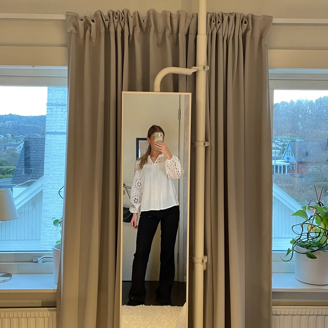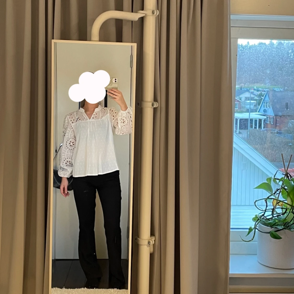 V ringad vit blus med mönstrade armar, aldrig använd.