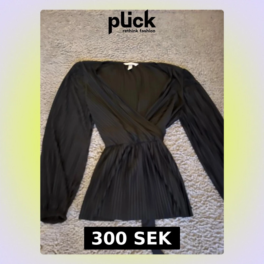 Snygg svart omlottblus med plisserat tyg och knytband i midjan. Blusen har långa ärmar och v-ringad halsringning som ger en elegant look. Perfekt att styla med jeans eller kjol för en trendig outfit.
